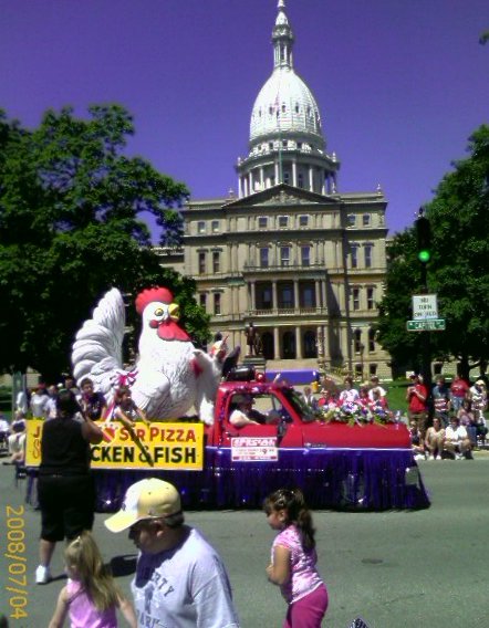 Never let it be said the Domination of Eiler hates nation-states; no good Emperor has ever hated his subject nations. Also, no righteous person of whatever religion has ever hated the holidays of another religion, as long as everyone gets the day off from work. And patriotism has practically always been the equivalent of religion. Christianity only took off when it started joining in the government-sponsored rituals, back in the days of the Roman Empire. Today being a day off from work, the Dominator considered a road trip to the continental EilerDepot near Chicago. But those who would take that trip from Lansing-Michigan this weekend, will find themselves fighting eight hours of heavy traffic, paying heavy fuel prices, and huddling in whatever restaurants are open and whatever hotels aren't booked solid. Along the way, that basically means a Holiday Inn in Michigan City-Indiana. Michigan City has its own charm, but it's already been conquered. Those who would stay in Lansing will instead get beautiful weather, a parade by the Michigan Capitol, a pig roast at the best pub in Eiler Town, and maybe some fireworks later. So has it been done.