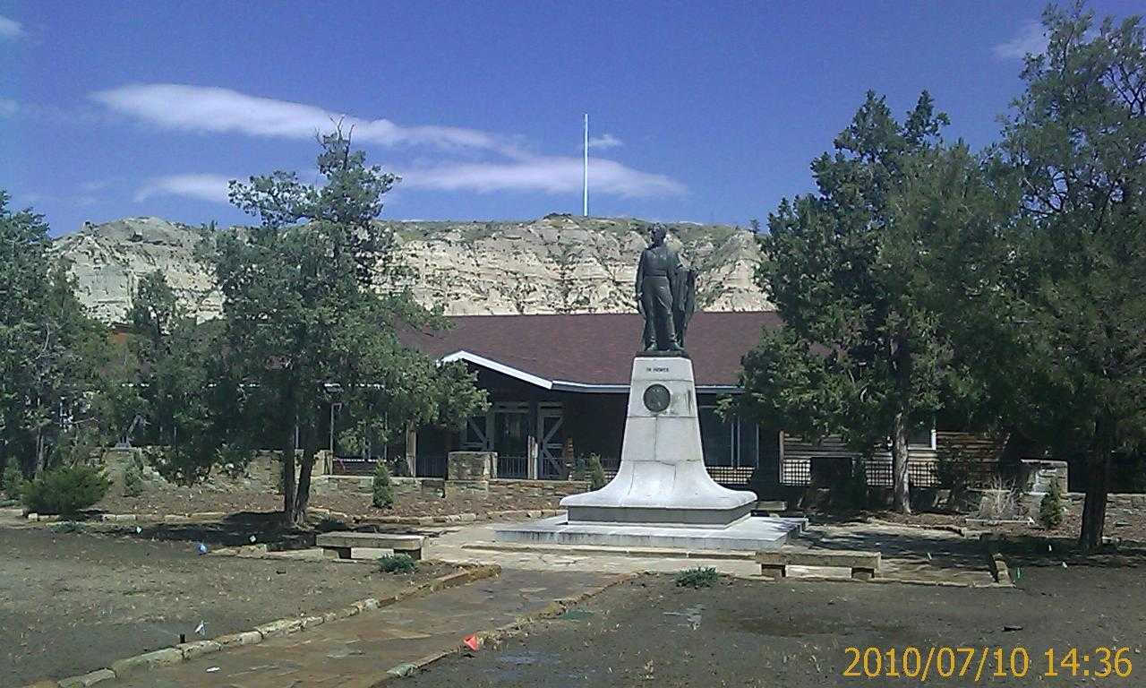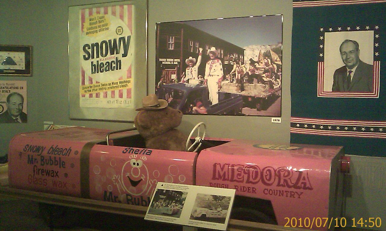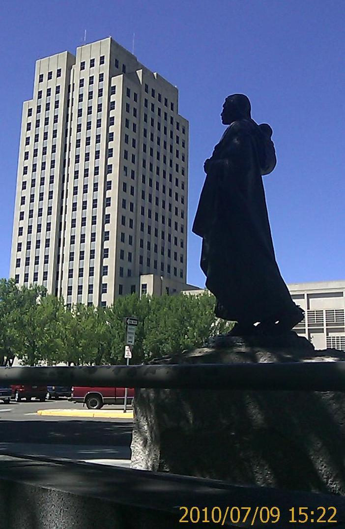Bismarck-North Dakota submitted to the Domination of Eiler yesterday and today. Amusement on the approaches, check. (Town museum in Steele; Indian ruins by the highway.) State museum, check. Statehouse tour, check. (It's a skyscraper, like only three other statehouses in the nation, very practical.) Cheap hotel, check. Cheap dinner, check. Cowboy museum, non-existent. It shows up in Bismarck on a Google search, but it's actually further west in Medora. The Domination's expeditionary force therefore raided the reconstructed Wild West town of Medora-North Dakota today, but found it rebellious.