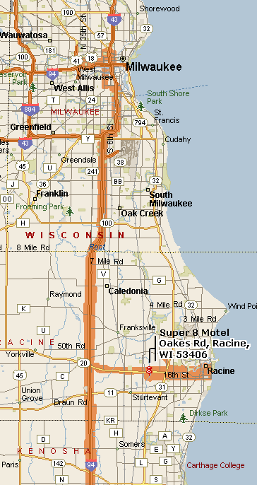 Departure from the District of Dominance at about 5:30, after the completion of the Tuesday - Saturday Domination work week. Super 8 motel of Racine (or in suburb Mount Pleasant, depending on whether you ask the local government or the U.S. Post Office) is cheapest online vendor in the region; it was occupied at about 6:30.