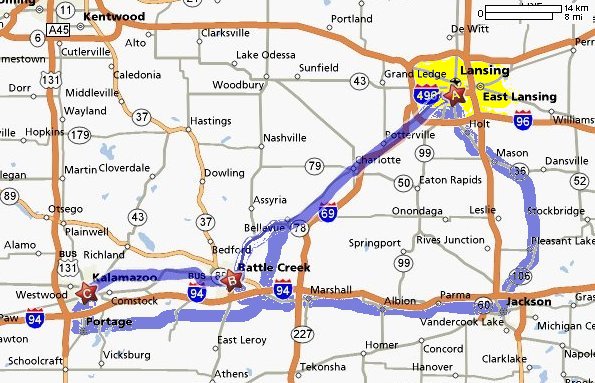 - Mile 3, 11:15 am: The Lansing Road of Jackson is not suitable for egress, because cars may demand the privilege of passing bicycles two abreast, so someone has to lose. Cooper Road chosen instead. This puts the South Michigan State Prison astride the travel route! Visitors not encouraged; unlike in Maine, the state prison furniture shop is not open to the public.