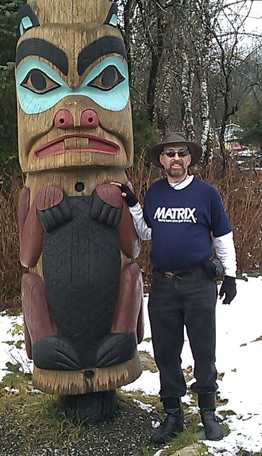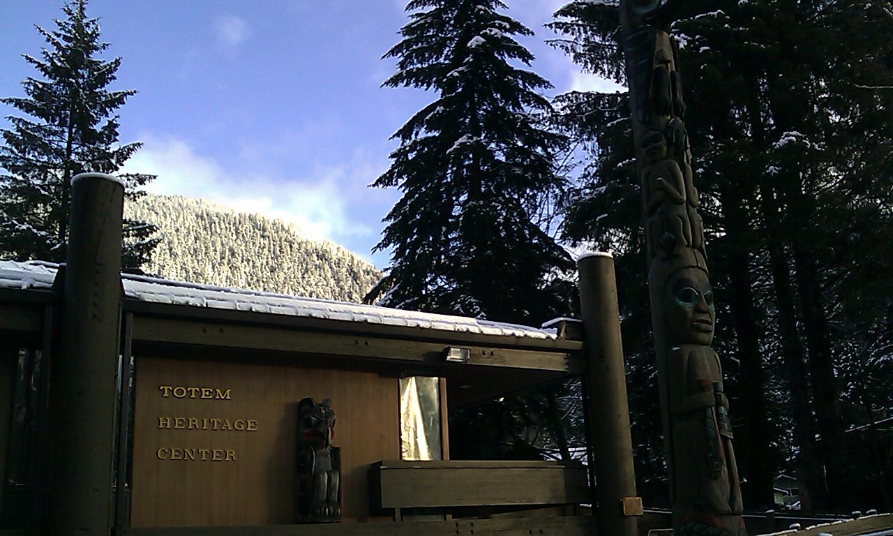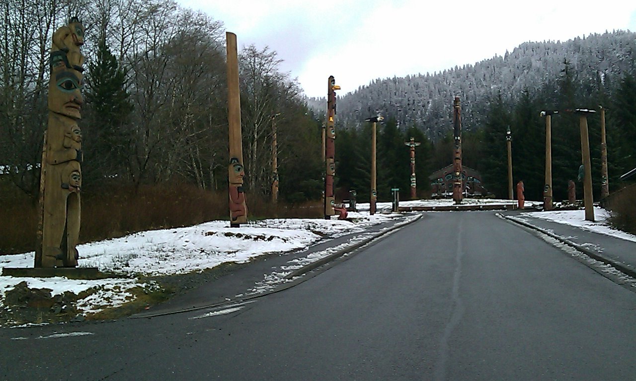 The season's first snow has come. This does not necessarily stop the Domination's bike patrol, but today might be a walking day. ... Well, walking is pretty useless, at least around town. The tourist bureau estimates that only 15% of the town is open for business. (That's about how much of the town seems to be foreclosed or condemned.) For all practical purposes, 15% equals one diner, one fancy little book store, one thrift store specializing in computers with the hard drives removed, two gift shops which sell tacky earrings, two sporting goods stores (already conquered), two full-service restaurants (already conquered), and six taverns where men mostly just sit, drink, and stink. So yes, Alaska is like Maine or Wisconsin in November, only more so. All is not lost, of course. The Totem Heritage Center is an easy walk from hotel, and open this afternoon. An Alaska stick has been harvested from the hotel parking lot, to assist in the walk.