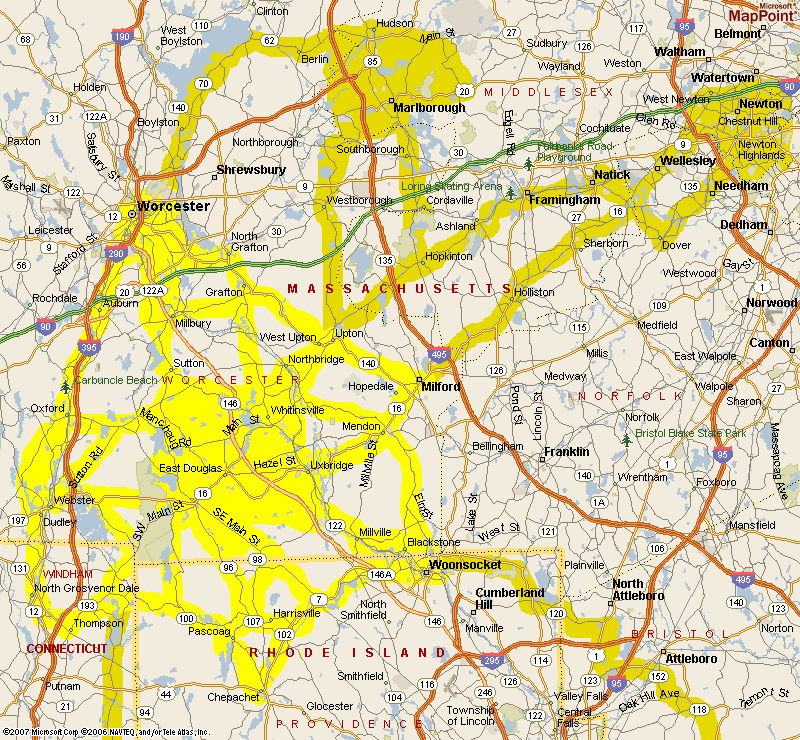 Boston dominates most of the area. But near the Rhode Island state line, Providence sends broadcasts too. |