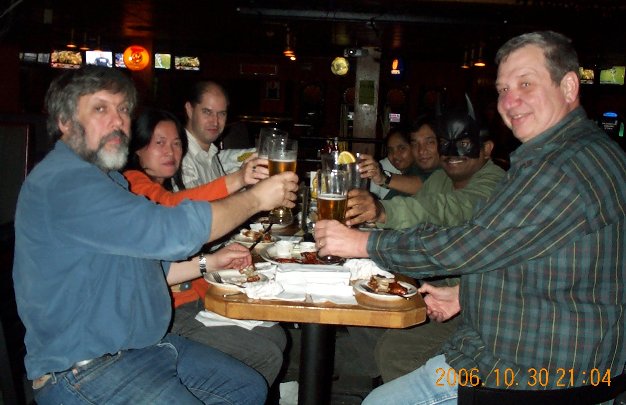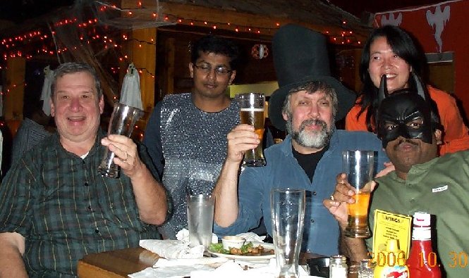 A toast with Mikhail, Maotze, Jerome, Deepa, Suresh, Suresh, and Pete. |