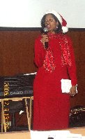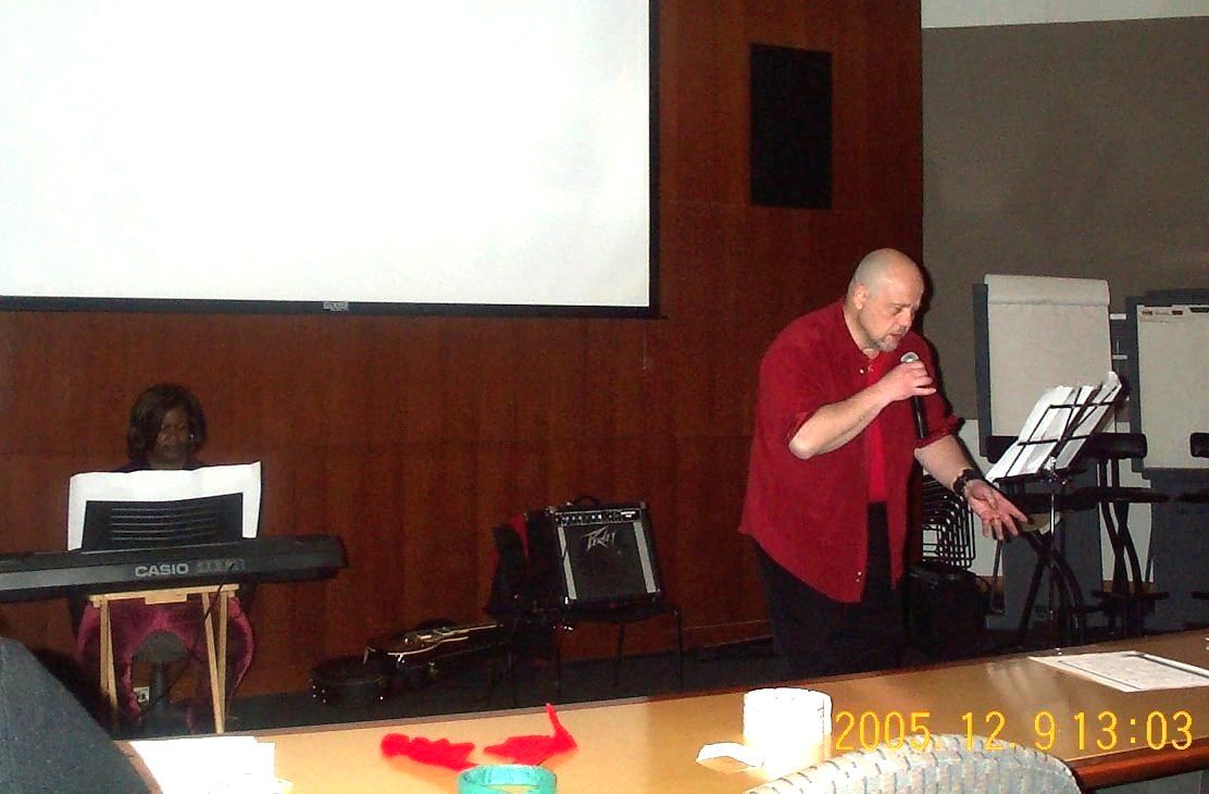 Vi contributed some modern seasonal Jesus-honoring music. Not pictured: By then, for benefit of the multi-cultural audience, Scott had reprogrammed the video to say "Ho Ho Ho". |