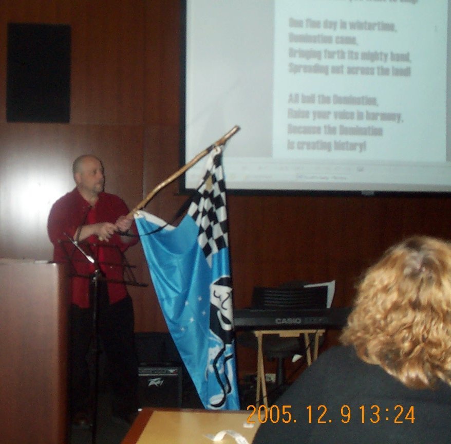 The show was so desperate for talent, they let Scott dress up as World Domination Santa, and lead a crowd in the Domination of Eiler national anthem! Conveniently to the tune of "Rudolph the Red-Nosed Reindeer". Joe, recruited as Santa's Helper, stood ready to hold the flag. |