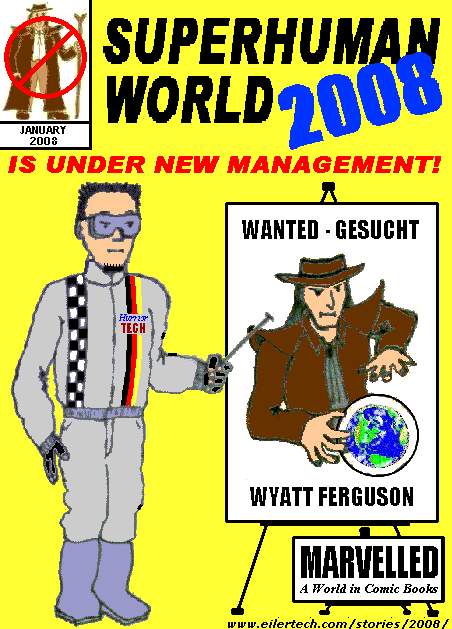 Public Service AnnouncementWANTED - Wyatt FergusonCollaboration with Hostile PowersWyatt Ferguson is accused of sabotaging a NATO aviation program last October, so that Russians were able to take exclusive control of Earth orbit in November. Mr. Ferguson has actively cooperated with Russians since then, and subverted and defied international, national, state and local authorities who wish to question him. For that reason I have assumed control of the Superhuman World web site which he once ran. (signed) Erik Katzman, the Hurrier. |