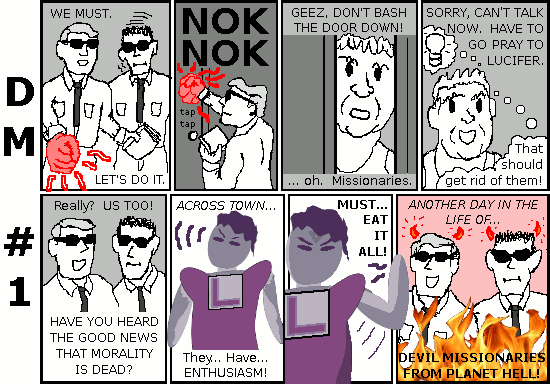 Horrible Name Lad and Poignant Death Lass: Stay Dead! Don't Stay Dead! Not Dead! The Devil Legion: (Satan Wants His Spine Back! SW10 LNH) Devil Missionaries from Planet Hell Devil Dog Brought to you by the stories of Eilertech.com . |