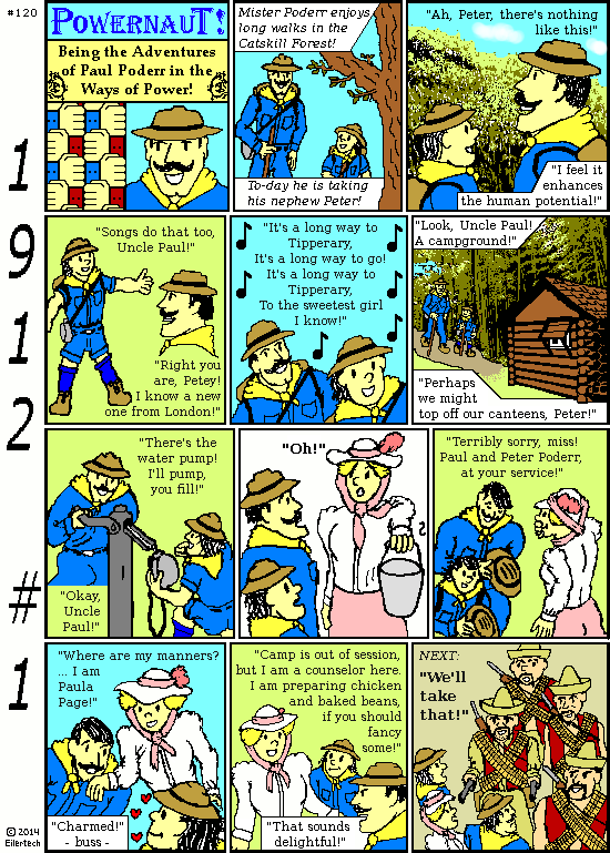 The more I learned about 1912, the more feasible the idea became. Comic strips not only existed then, they were in their Golden Age. 1912 was notable for one comic strip everyone may recognize: "Little Nemo in Slumberland". The strips were about double the size as the present day, and more verbose. The art was as detailed as any time ever since. I've tried to reflect that in Powernaut 1912. I've "outsourced" some of the forest scenes, but I think that fits the spirit of the times also.
