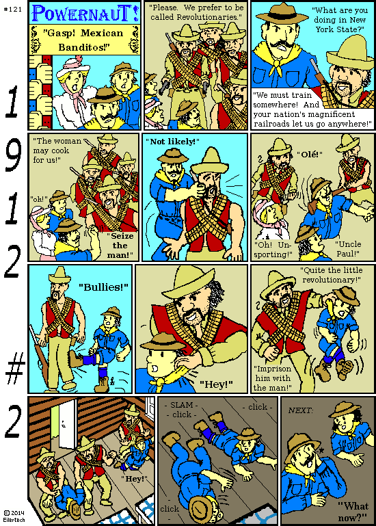 Mexico figures in the plot. It was having a revolution then, with at least four rebel factions that year if you count the counter-revolutionaries. People of the modern age can imagine Afghanistan just across the Rio Grande, with foreign powers openly meeting with rebels in New York City. So the plot's mercenaries turned into revolutionaries, at least in name. I've put in some "current events". Ironically, Pancho Villa's faction had the best U.S. support at the time.