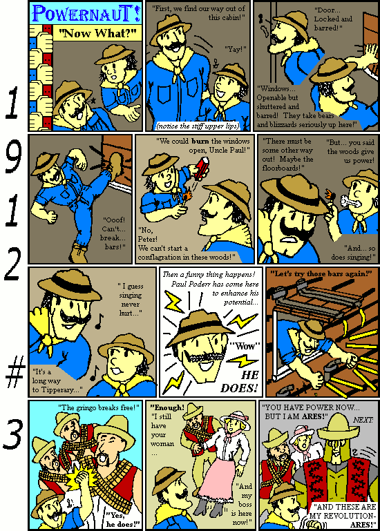 The plotline for this series came to me as a snippet, about the Powernaut, a campground, mercenaries, and Ares. It was an intriguing idea, but I felt I should roll dice to decide which year. At the time I got the idea, the Powernaut's plotline went 71 years, from 1941 to 2011. 71 years don't fit on dice. So I asked, why not 100 years, all the way back to 1912?