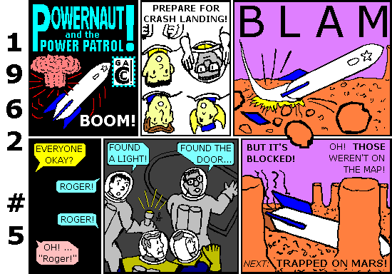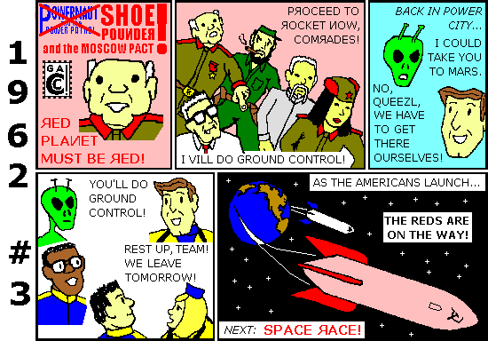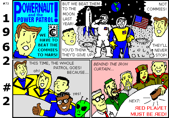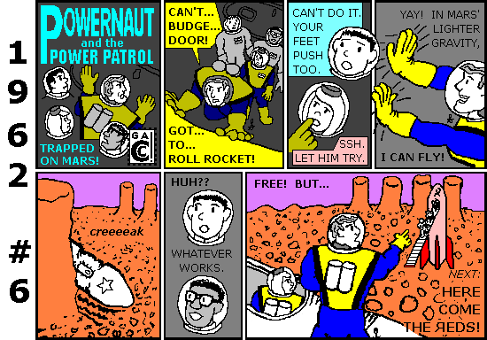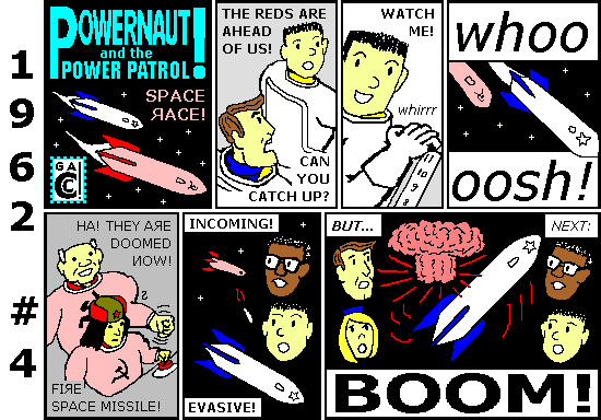 As I did in 2011, I've dividing this series into parts so nobody has to wait for thirteen strips to download. And I'm being careful with the artwork. For instance, with modern technology I could put fifty white stars on a small navy blue background... but that's not how they did it in 1962! First, the penciller and inker had to make sure the stars and stripes were all there, if they cared. Then the colorist made the U.S. flag black on Powernaut blue because it was as detailed as he could get. And he got his minimum wage no matter how popular the comic was. It's 1962 all over again!