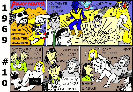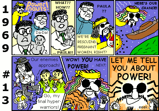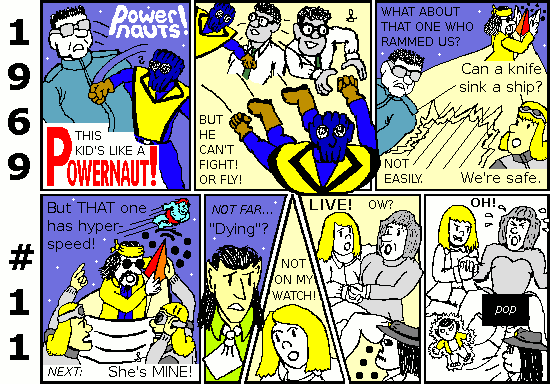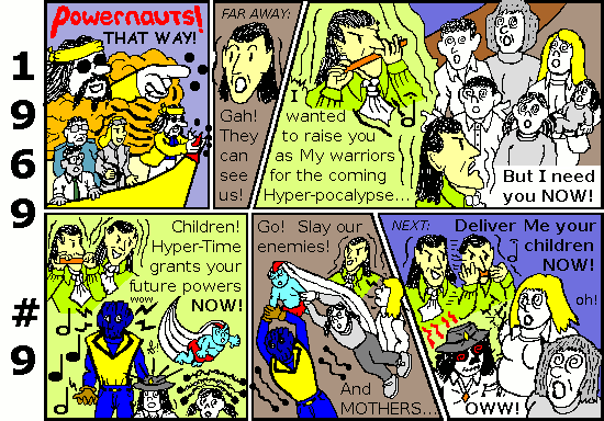 This series has the advantage of a highly-developed future timeline, full of Children of the Future! The Hyper-Piper can read about these children, because he can go outside the timeline. (www.eilertech.com/stories/) The series was explosive enough already with *four* captives from there, but I went ahead and picked six. I think the drama will only be enhanced; indeed, they all became essential. The detail of whether the Children of the Future have intrinsic powers, wielded powers, sponsored powers, or what, has turned out *mostly* not to be important to a Powernaut comic. And the interaction among *mothers* explains a lot of things I've never mentioned in my stories. 8{D>