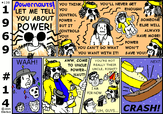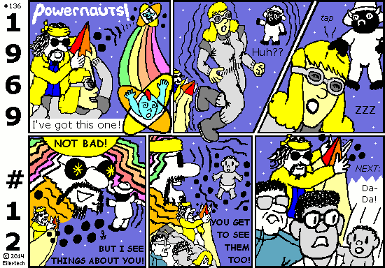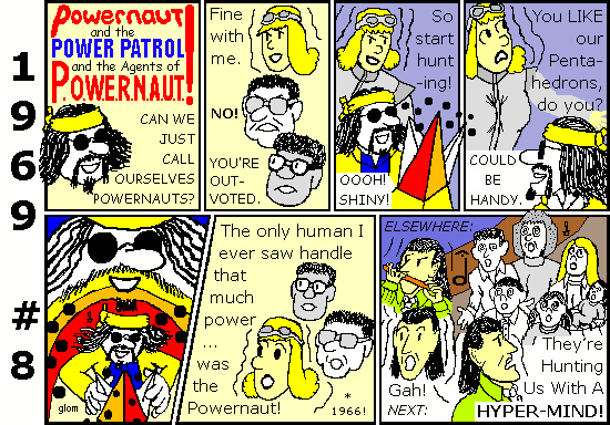 GreetingHello, Readers! This series *still* explains a lot of stuff. And it's escalating. I'm still going to let it speak for itself for now. (signed) Scott Eiler for Powernaut Comics, 1969.