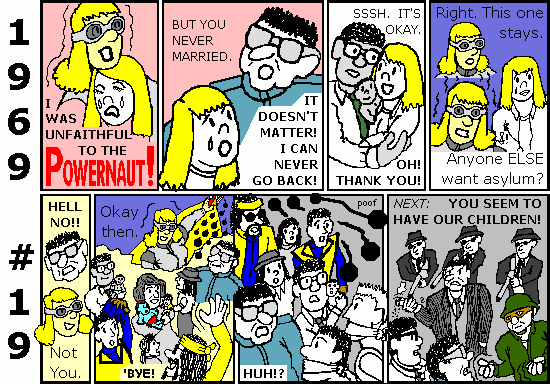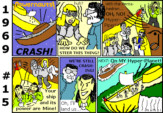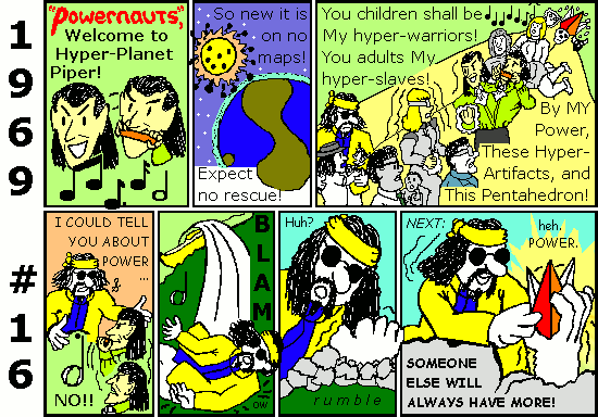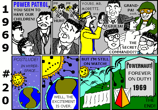 The comic series includes some conjecture on what happened to the real Powernaut after 1966. I don't have enough information to comment on that. All I can say is, I never saw him again. I still miss him. He was mature enough (by then) to spend an extra day to get ready for a mission - as for our Mars mission. I have to wonder how the 1969 situation would have resolved itself if the self-styled Powernaut had not intervened. The comic strips admit that our Power Patrol was already on the trail of the kidnapper, and other interested parties were about to make contact with us. They'd heard of our teleportal technology, which was key to the mission even with this Powernaut around. I like to think that if the rest of us had all had time to plan and equip a proper rescue mission, we would have enjoyed at least as great a success, and possibly even determined the fate of the real Powernaut. Still, the Powernaut of 1969 was experienced at detecting and handling superhuman power, and a master at coping with impromptu situations and resolving them on his own terms. And whatever his reasons, he stood in for the real Powernaut at the Power Patrol's time of need. In those ways at least, he had the characteristics of a true Powernaut. |