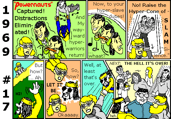 The reference to "Let It Be" might seem anachronistic in 1969, since the song was released in 1970. However, Paul McCartney might have had an early version or the song floating around - or he might have swiped it from the Powernaut instead of vice versa. Yay, Powernaut!