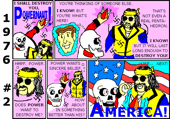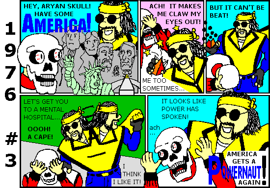 Powernaut comics were hardly alone in suddenly finding patriotism during the year of the American Bicentennial. I don't know the state of mind of that particular Powernaut, so I can't say whether he truly felt pride in America. But I can tell a story about the real Powernaut. When we were in France in 1944, I told him I wanted to be as inspiring and patriotic as him someday. The Powernaut just tugged at his tunic and said, "Do you think yellow's a patriotic color?" "Well, not in our country." "There you have it." Now I realize, the Powernaut only became inspirational by accident. That's known from his origin story in 1941. He was just trying to do the right thing. The rest is history. Having met the Powernaut's replacement, I believe a similar thing may have happened. He was obviously a moral man, trying to do what he felt to be the right thing. When he took up the Powernaut's name, he got the Powernaut's enemies with it - as witness Aryan Man. I can testify, the presence of any Nazi is enough to make people believe in anything which is the opposite of Nazism. Like America. So, the Powernaut of 1976 might truly have had a patriotic moment. |