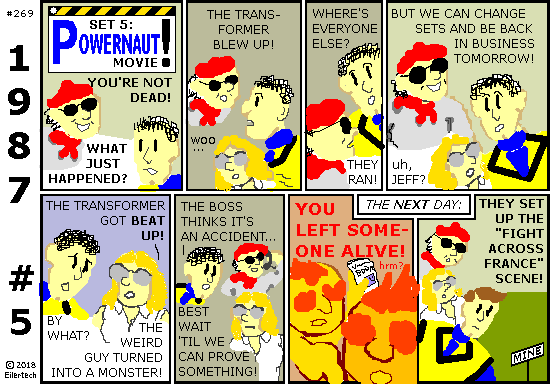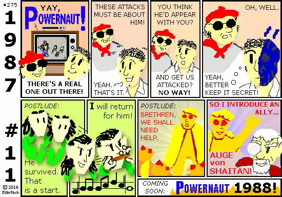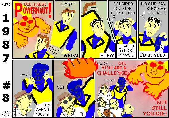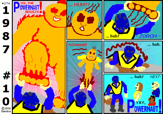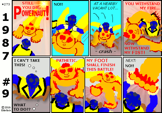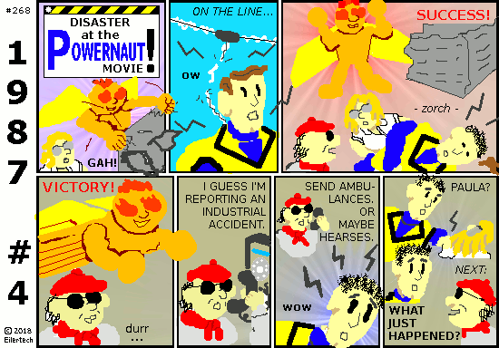 This story is mostly here so I can bring forth the Powernaut of the 1990s. In future stories, I am going to throw everything I can at this Powernaut. This will include the Doom Bear, Wyatt Ferguson Year One, and Ellipsis Year Two. There will be lots of 1990s style stuff too, with lots of old foes. And a 1999 apocaplyse too... This story turns loose from here. Heh, I wish it could happen already. But I have to finish *this* story first. So let's slog through together.
