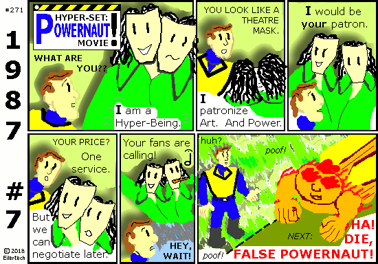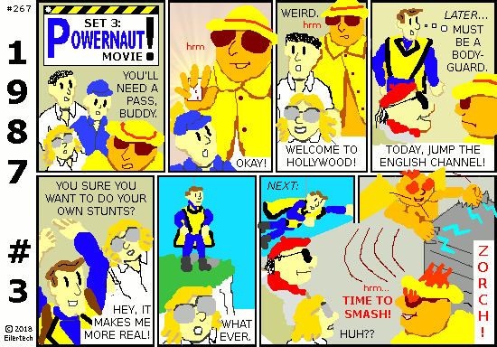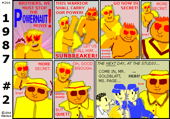 I hesitate to drop names, but Mister Goldblatt and I actually go way back. He was one of the Hyper-Children in Hypergaard 1969. He was the one who was dressed like a Powernaut then. So I paid close attention to his career. At first when I heard of the Powernaut movie, I wondered if that was the reason he was dressed like that in Hypergaard. But... well, keep reading this series to find out. |