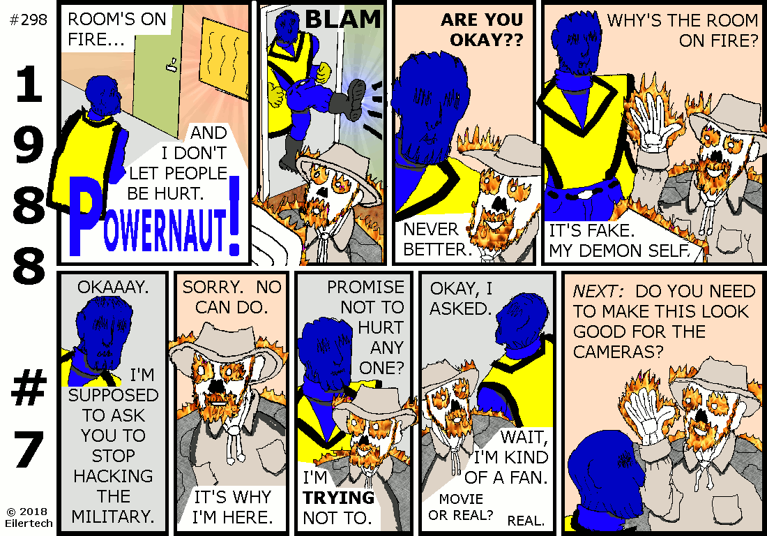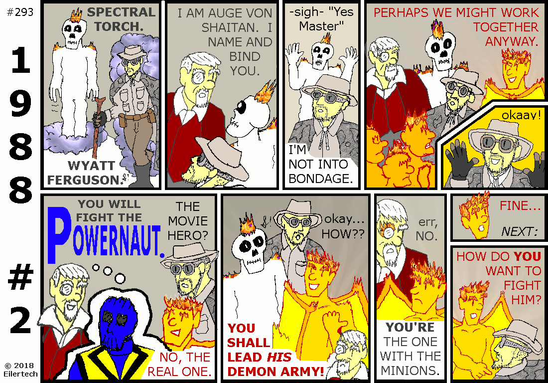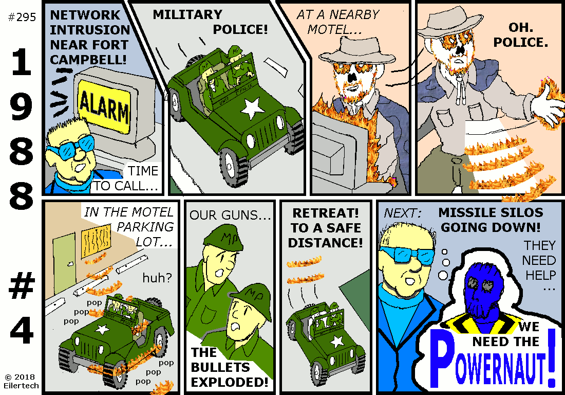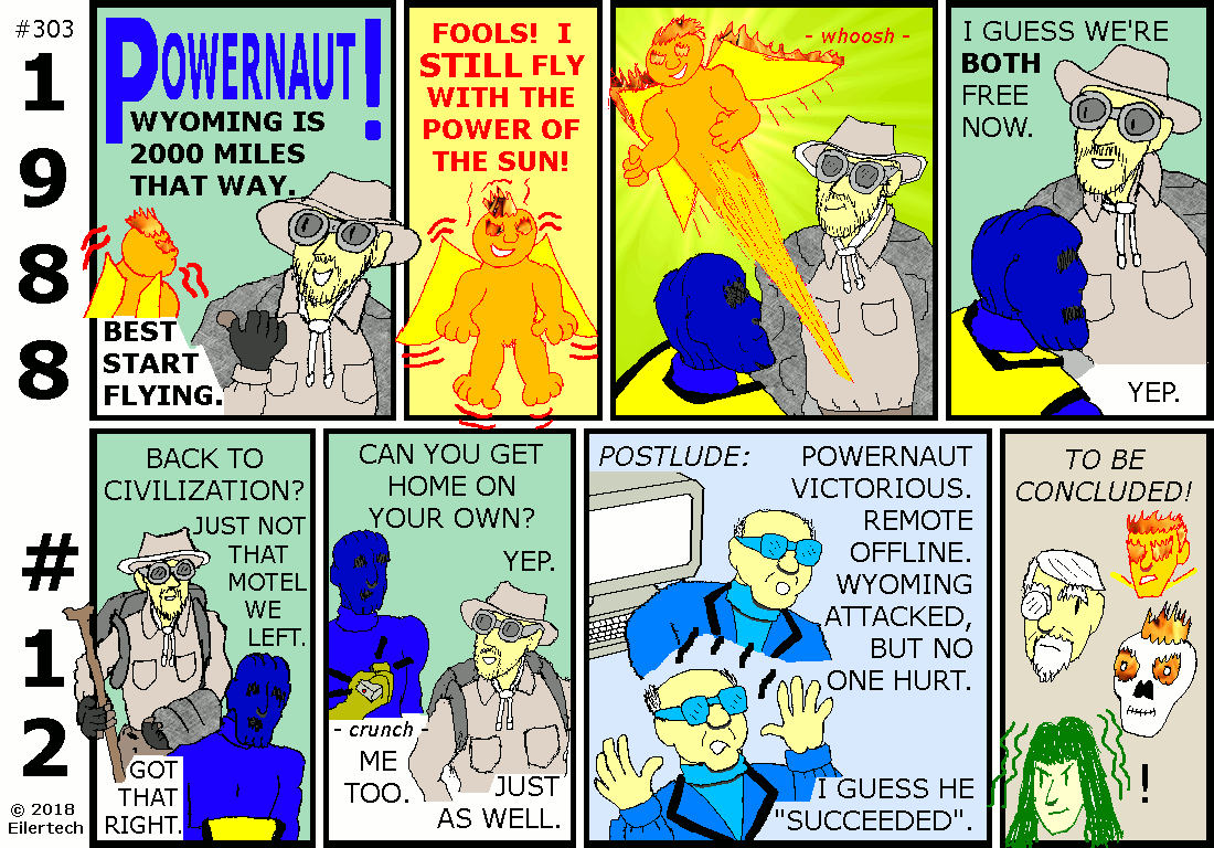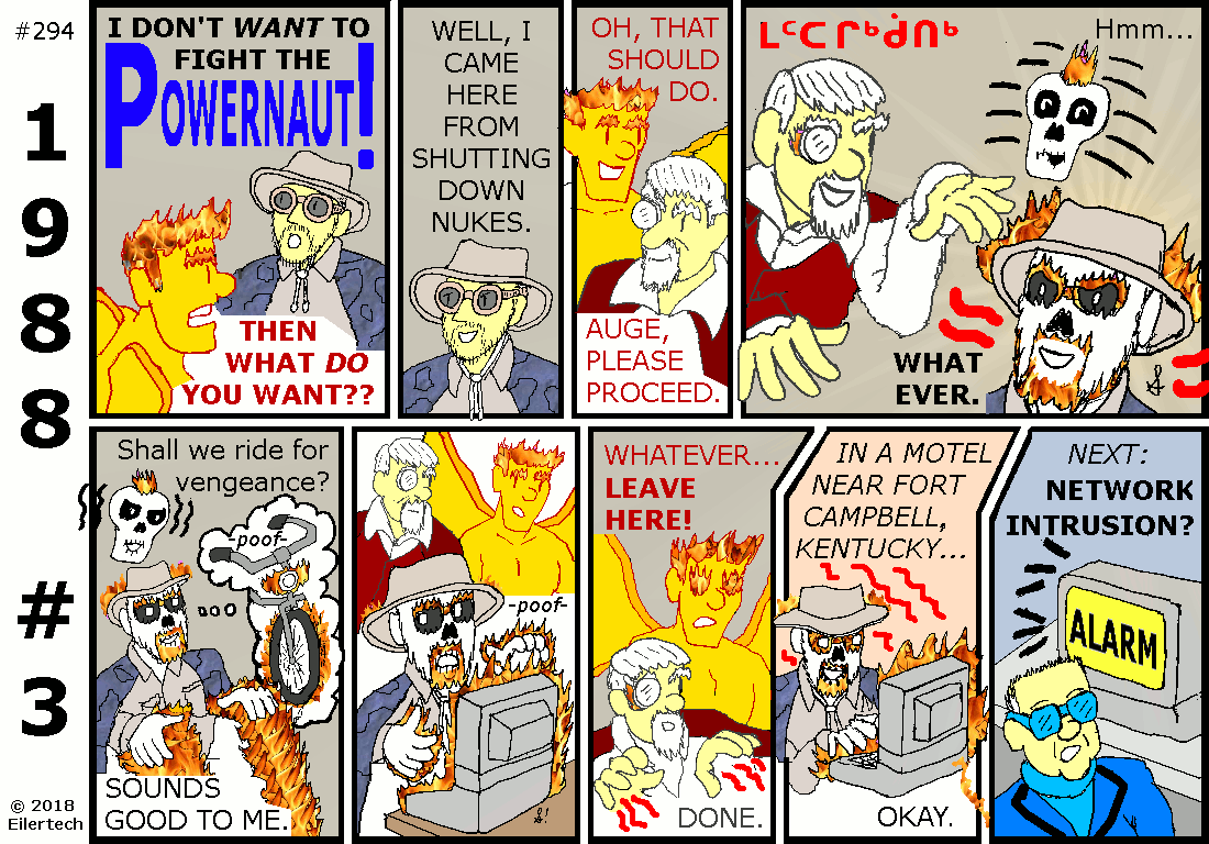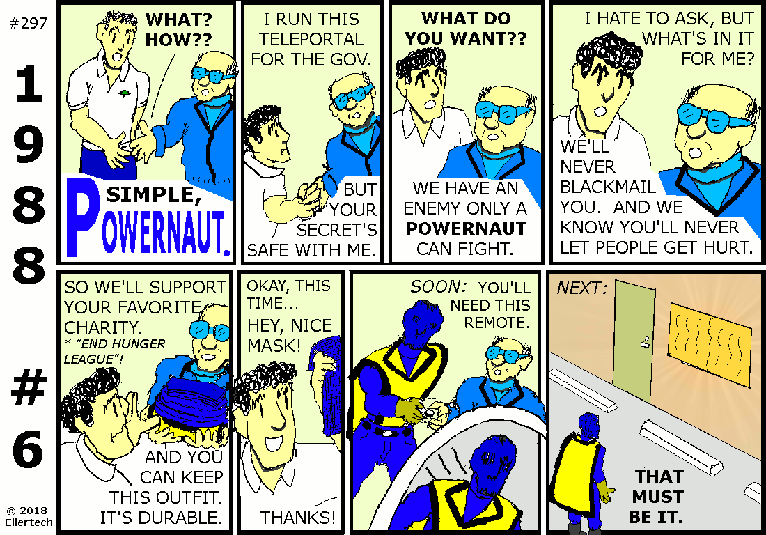 One might wonder why I seemed to be blackmailing this neophyte Powernaut into working for me and the U.S. Armed Forces. I considered it to be more of an introduction. The United States Government has a legitimate interest in the superhuman powers of its citizens, and it was going to introduce itself to this new Powernaut in any case. I kept this as cordial as possible. One might also wonder why I was so lenient on this Powernaut when the mission didn't go exactly as I intended. I consider that to not have been the Powernaut's fault. Who could have expected his opponent to send his power elsewhere, while himself under attack? About that opponent... Wyatt Ferguson was himself of interest then. He was just harder to find than the Powernaut was. About the subterfuge... The strip implies some collusion by Wyatt Ferguson and the Powernaut. I had no reason to believe that at the time, however. Neither did the many other observers, including Auge von Shaitan who supposedly had mystic vision powers. And Mr. Ferguson has already admitted, his recollection of the events are confused. About the target... Only the U.S. Air Force command and control systems were disrupted. U.S. nuclear submarines were unaffected. A similar disruption happened on the Russian side then. In short, United States security was only minimally affected. |
