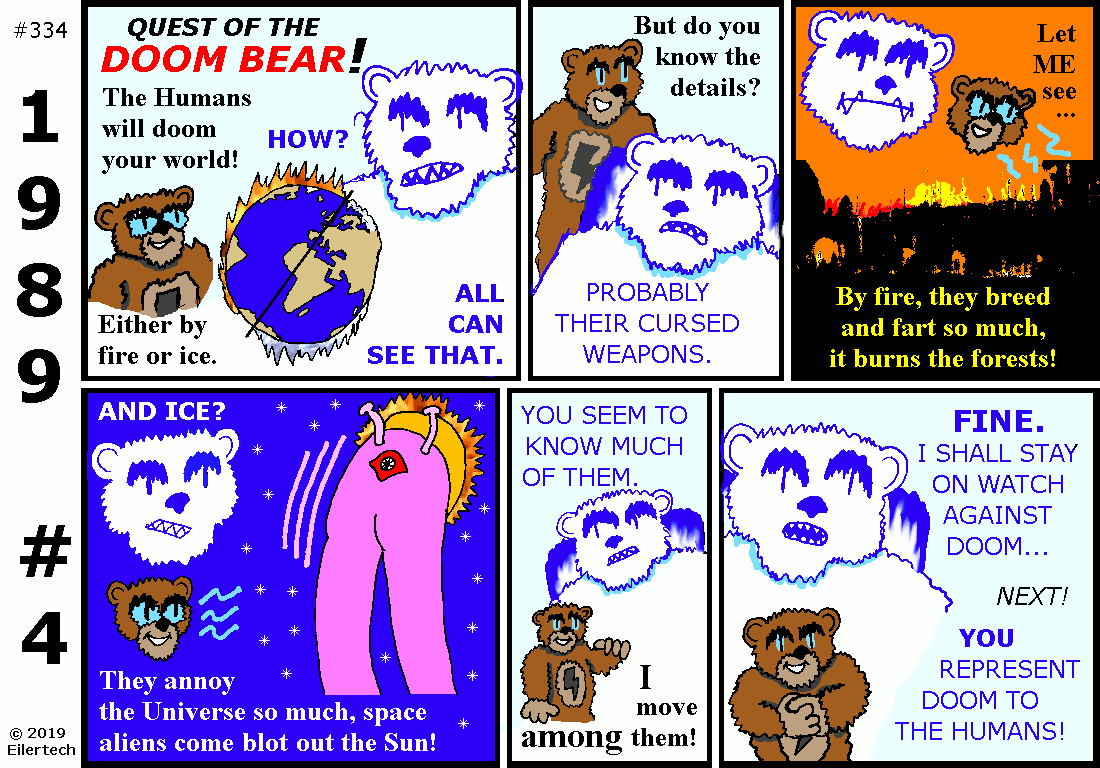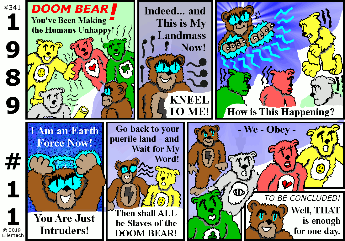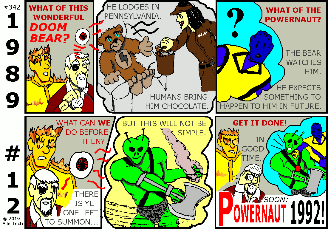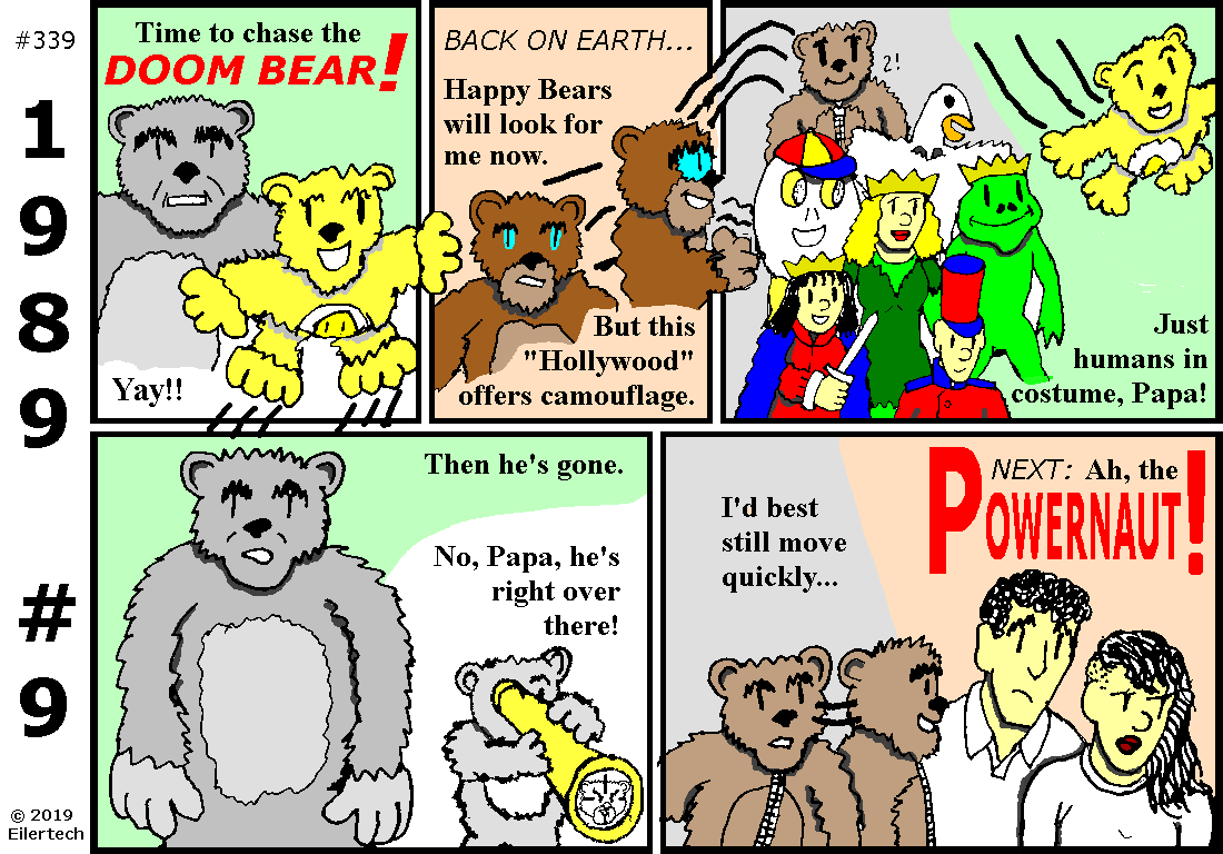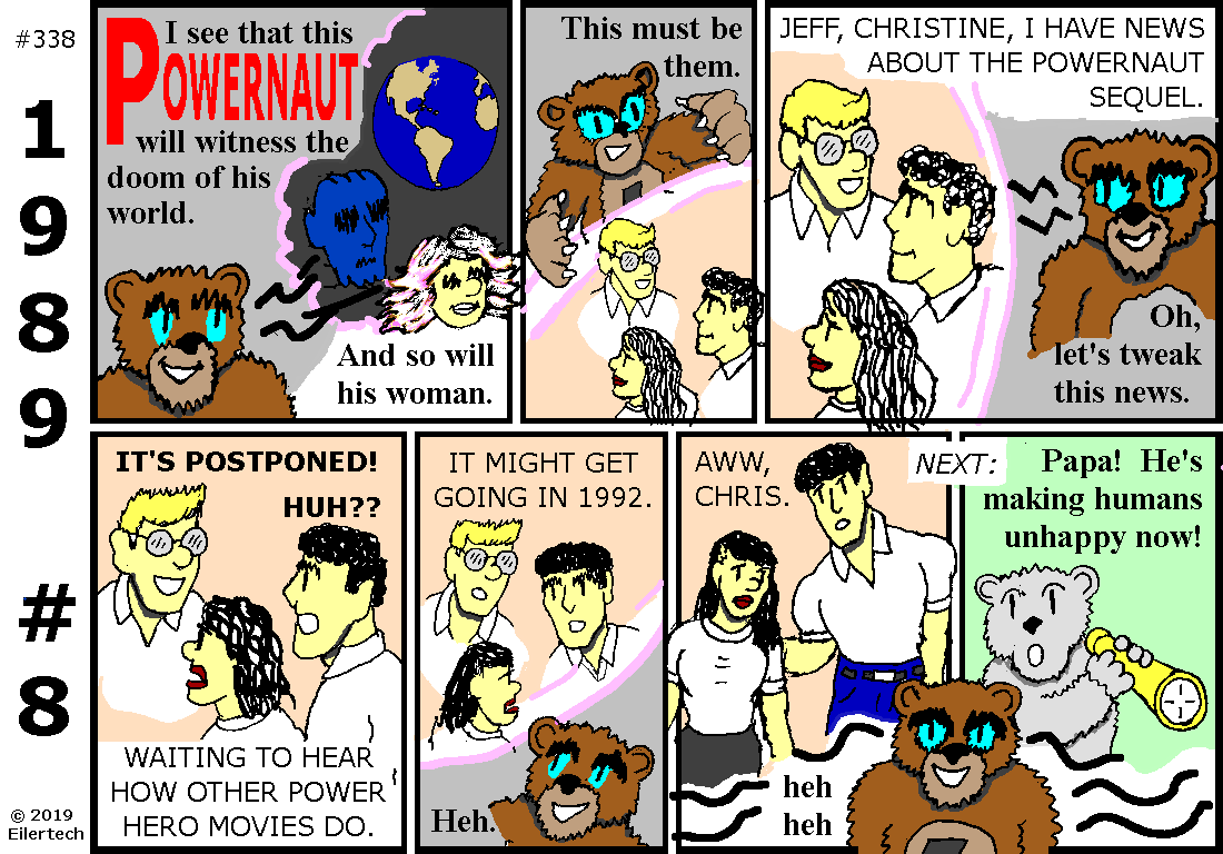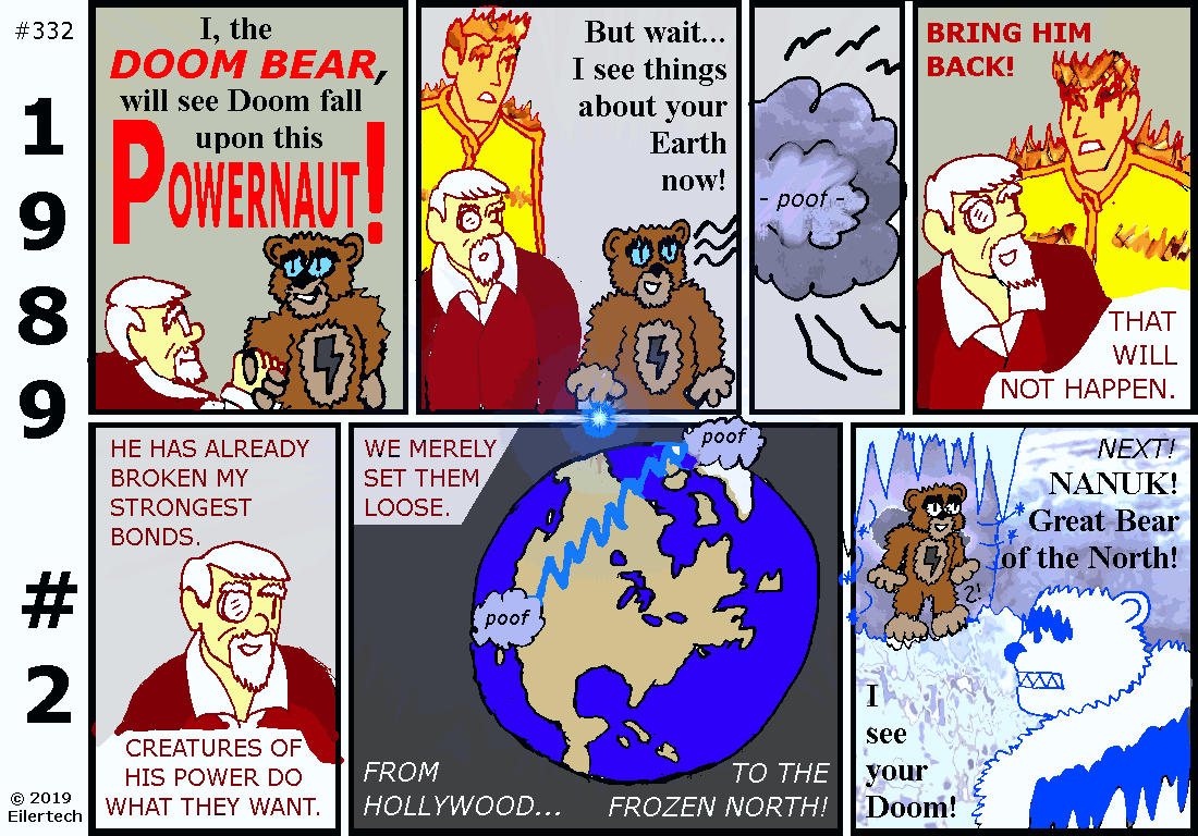 I'd like for this Doom Bear episode to have been in 1990, so as to slavishly follow Marvel Comics which was bringing back villain comics then. The occasion was Thanos overflowing from a Silver Surfer plotline into his own villainous quest, which would eventually be the basis of the world's highest-grossing movie (or two) up to 2019. The Doom Bear has likewise overflowed Powernaut Comics. But he's on a timeline, so he has stuff to do later in 1990 - when Ellipsis shows up. And Christine Lassiter needs some time to get there too. Hence, Doom Bear 1989.
