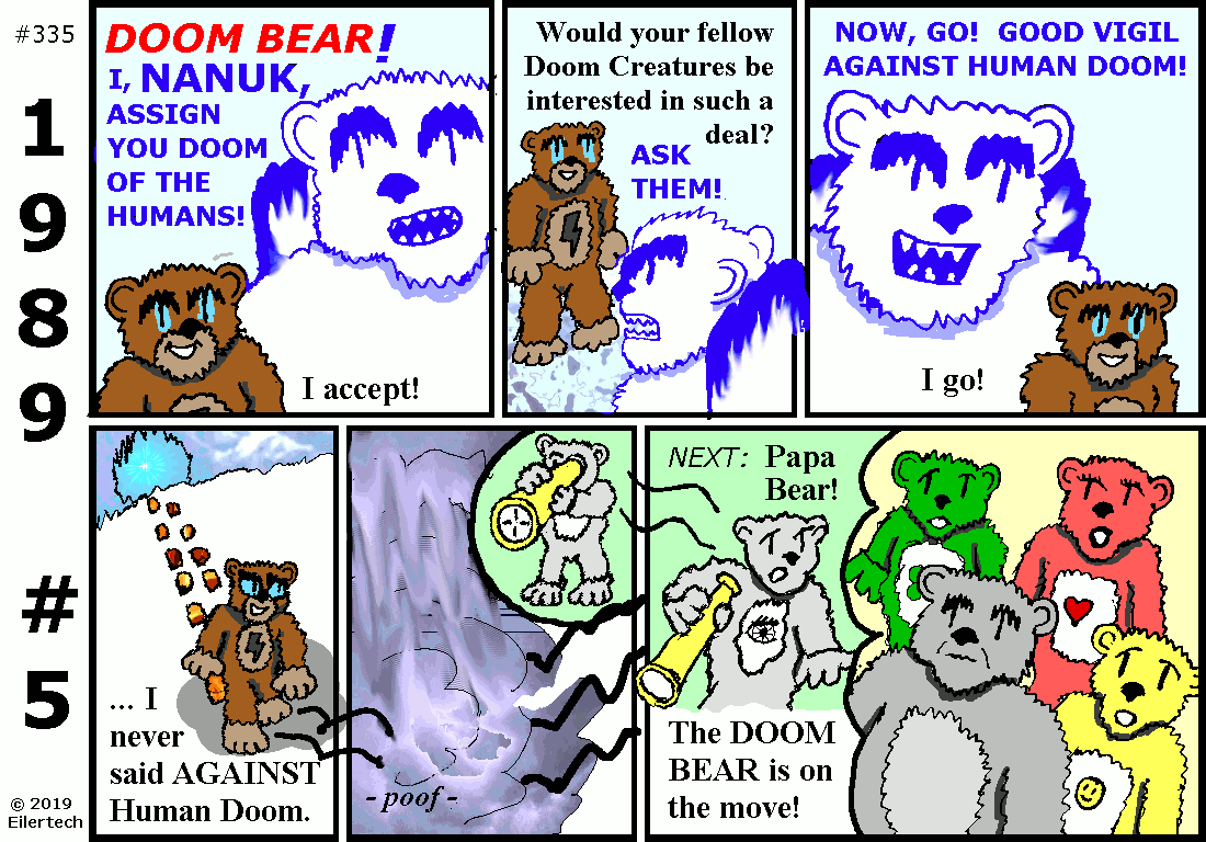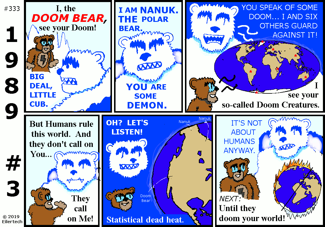 Well, crap. The early 1990s turned out to be a power struggle among the U.S. Gov, Ellipsis, and the Doom Bear. I'm pretty amazed that Powernaut Comics claims to have the origins of *any* of this. But I can't say they're wrong. I've visited the Canadian Arctic. So I recognize their alphabet. I see Auge von Shaitan is using actual Inuit words. The ones he's using, translate to "Summon Destiny Bear". The Inuit do not have a word for Doom. But the Doom Bear suddenly seems to want to meet the Great Bear of the Inuit lands... This certainly wouldn't be the first time an evil mage miscalculated and the rest of us had to live with the results. |