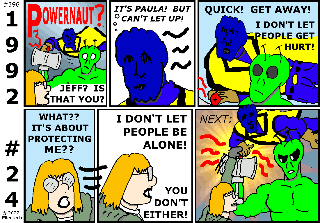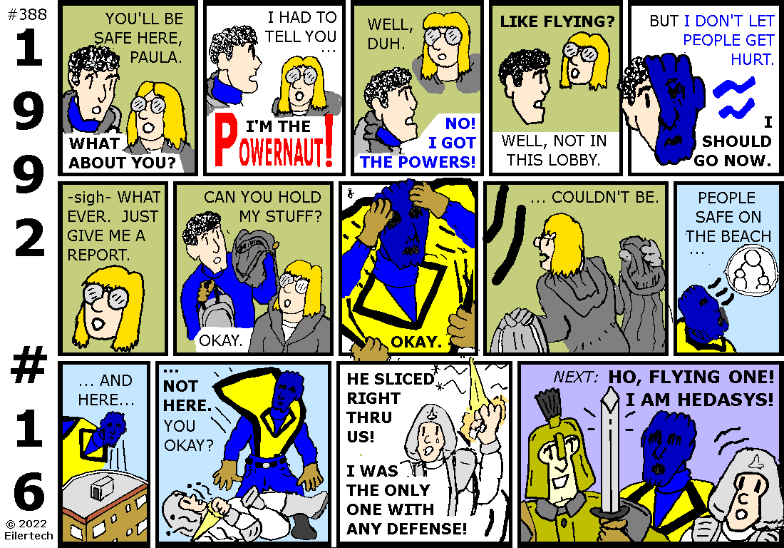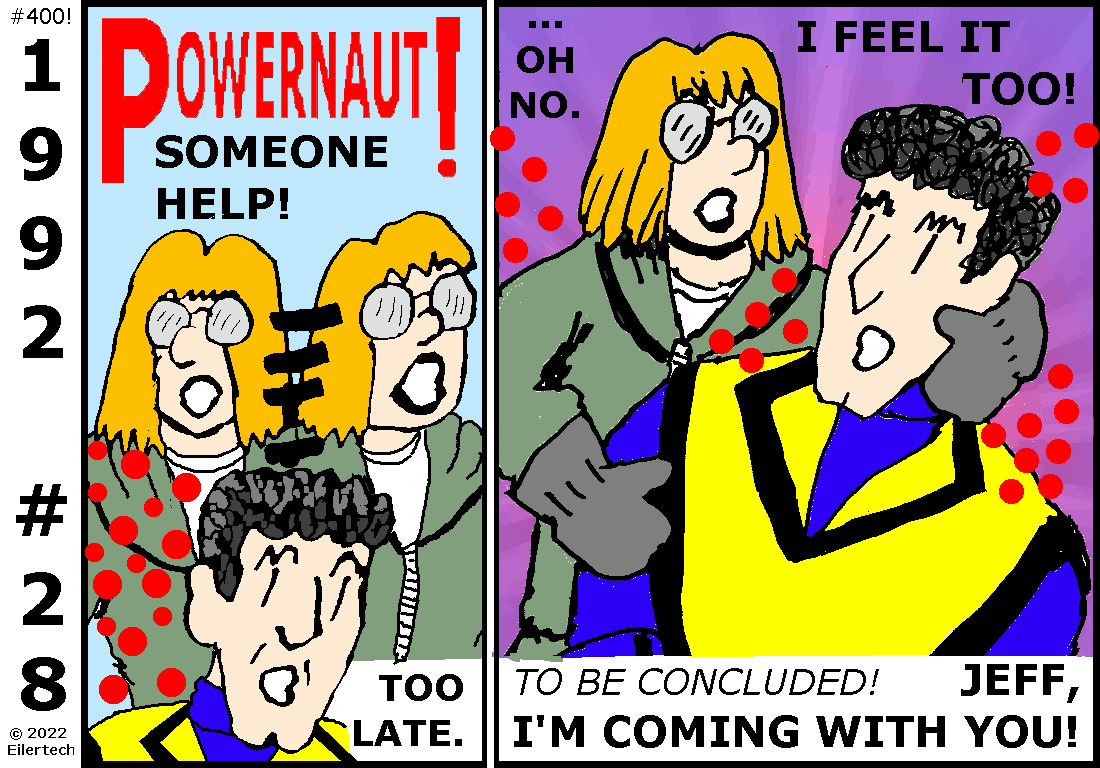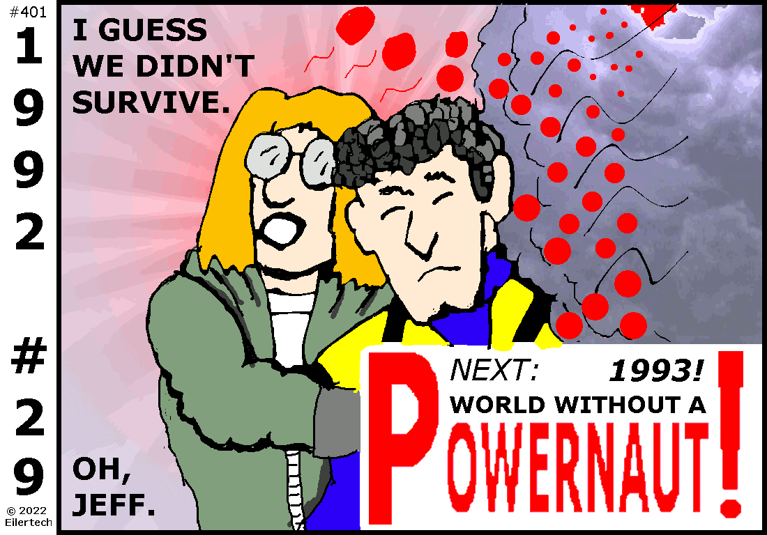 The Artist would like to note, the panel-heavy early strips burned him out for a while. At sixteen strips, this was the longest Powernaut episode either. (There was no good way to break it up.) But the Artist caught up when the later strips had one or two drawings. Much of Powernaut 1993 will be like that also... thank the One Maker.