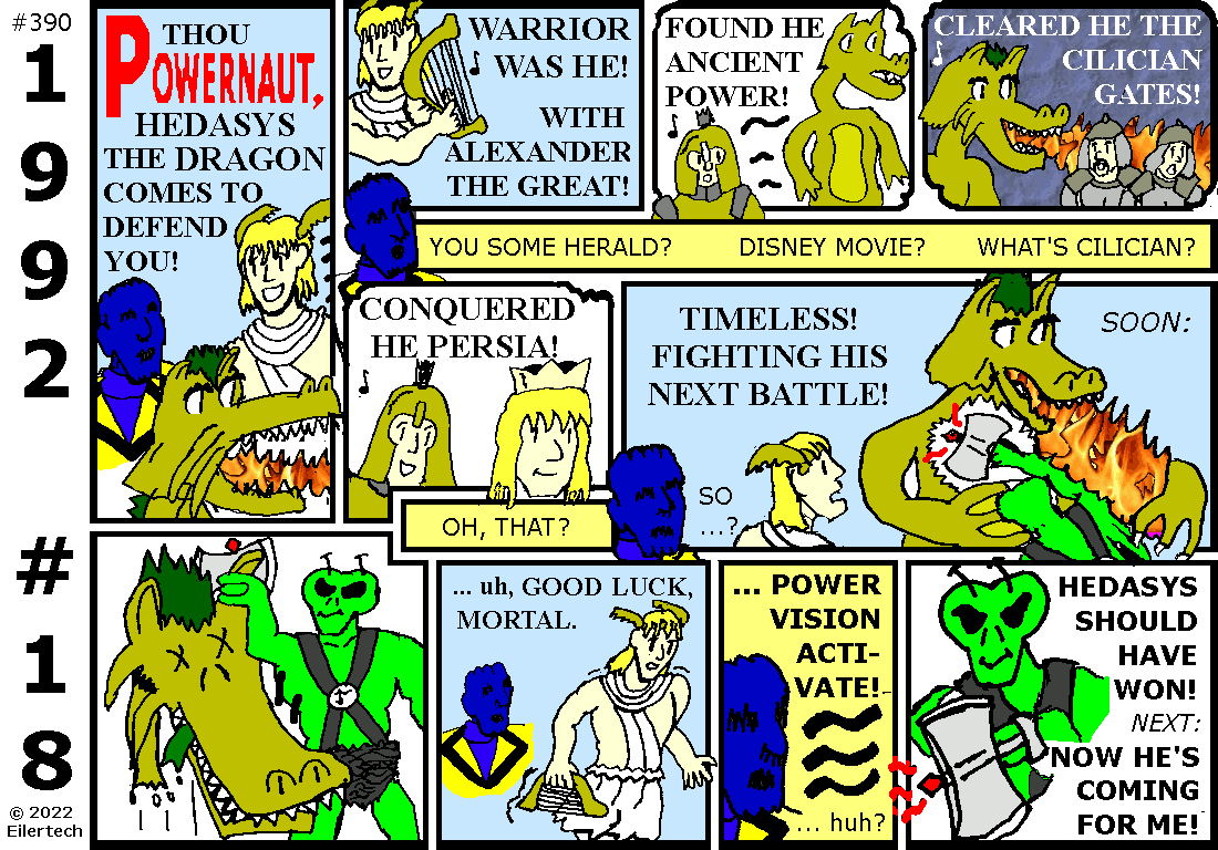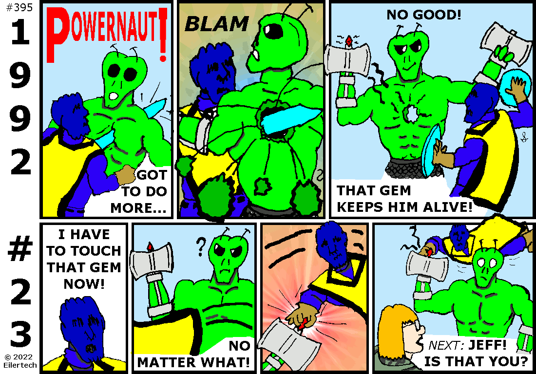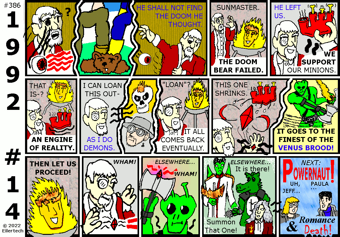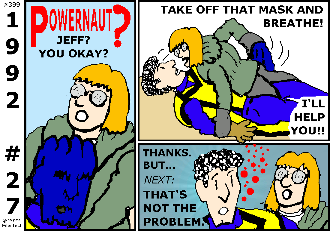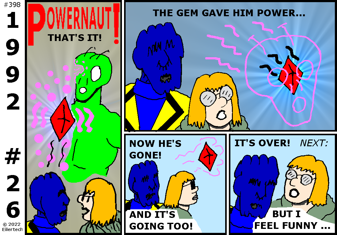 The Artist would like to note, the panel-heavy early strips burned him out for a while. At sixteen strips, this was the longest Powernaut episode either. (There was no good way to break it up.) But the Artist caught up when the later strips had one or two drawings. Much of Powernaut 1993 will be like that also... thank the One Maker.