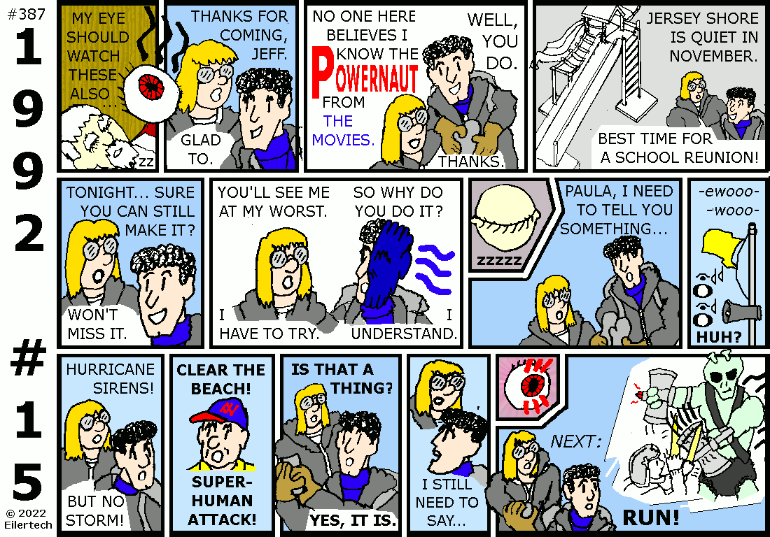 This strip shows Auge von Shaitan, handler of the Eye of Satan, going to sleep. He released Satan's Eye to watch the world for him in the meantime. Apparently the Eye went to sleep too. It did not notice one of its targets, the Powernaut, envisioning his power. If something is envisioned, the Eye can see it. But it was asleep... That's almost human! I'd guess it went to sleep around the time that Our Lovers were hanging around playground equipment which is the height of entertainment for that part of the Jersey Shore. |