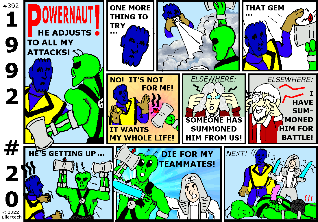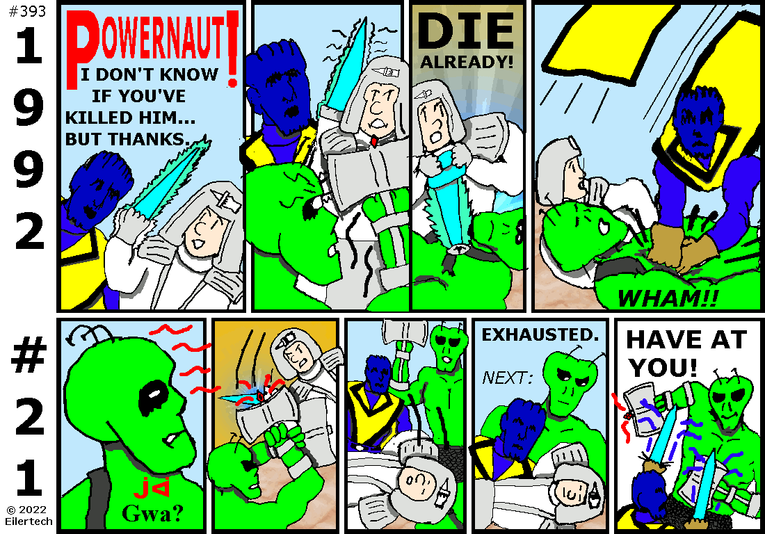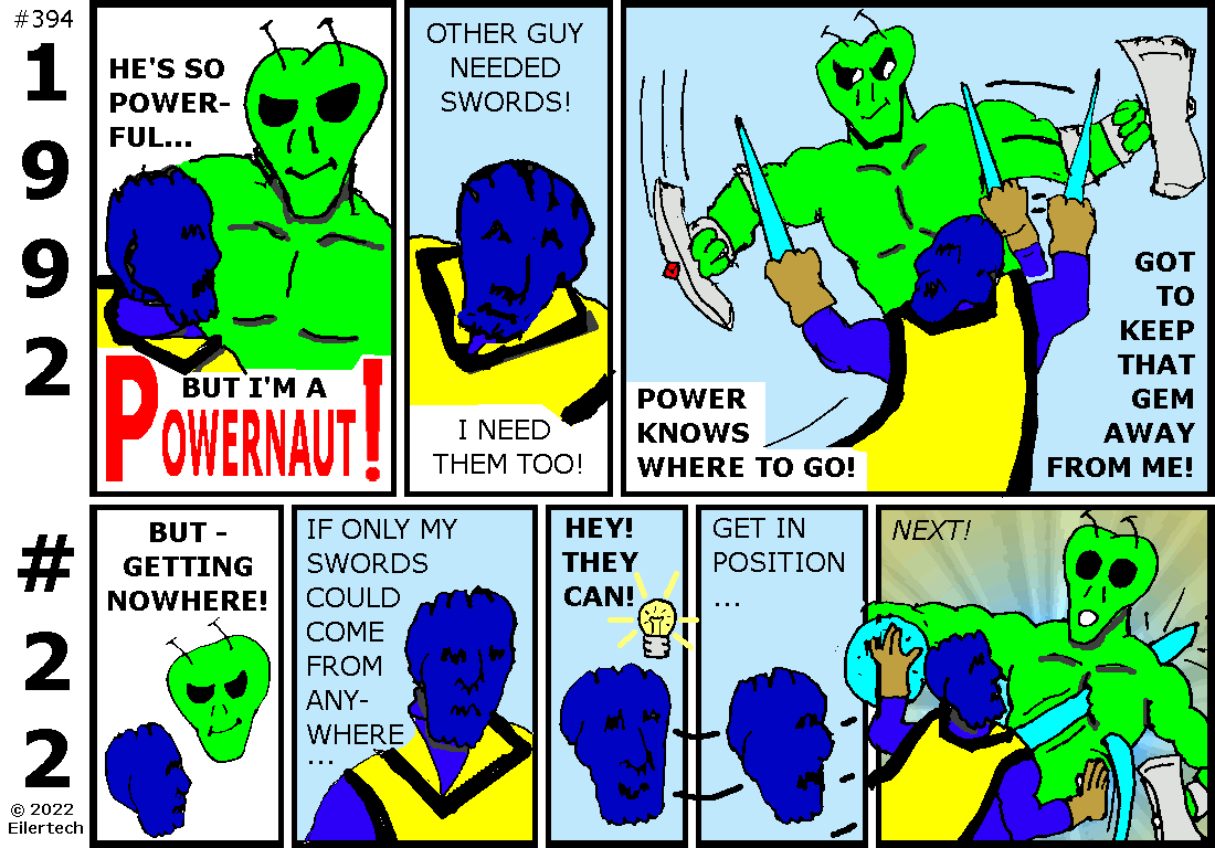 The Powernaut seems to have quickly adapted to swordplay. Perhaps he did that in his day job once. He did all his own stunts, after all. And as he said, Power Knows Where to Go. |