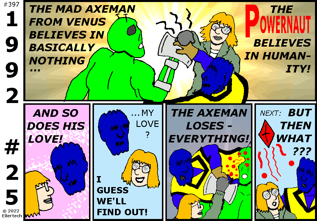 This guy has earned some separate mention. He was a member of the villain minion Counter-Ellipsis Force, and then the U.S. Gov's minion force Counter-Conversion. In that latter force, after Ellipsis fled the United States, they were the Gov's most reliable source of national defenders. So when the Mad Axeman from Venus attacked, they became heroes. His team included at that time Rad-Man and Rolling Thunder. Those others had energy powers. But against an axe-wielding super-being from Venus, that didn't help. Only Swordhand had the weapons to stand up to that being for any time. Swordhand seemed to survive this encounter, but has withdrawn from the public eye. The fates of the rest of Counter-Conversion are uncertain. I've heard rumors that Rolling Thunder survived, 'cause energy powers which largely consisted her body. Or something. Rad-Man, not so much. During this encounter, the Powernaut actually turned his back on his enemy, to check on his ally! The Mad Axeman from Venus was so interested and alien, he checked also! Then that peaceful Powernaut actually made his own weapons and took them up against his enemy! Probably he was too busy to find out if firemen had evacuated *everyone* from the battle region. So he still defended everyone. The Mad Axeman from Venus reacted as expected. |