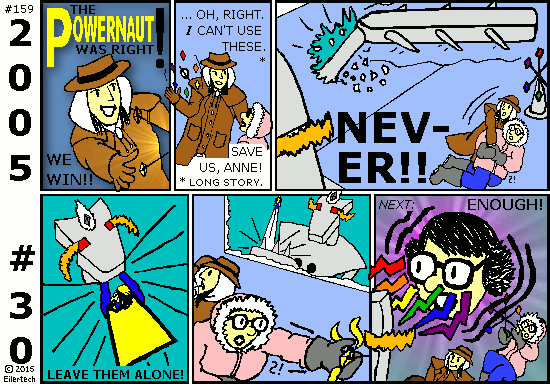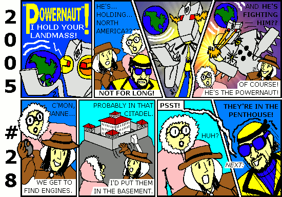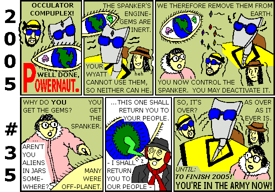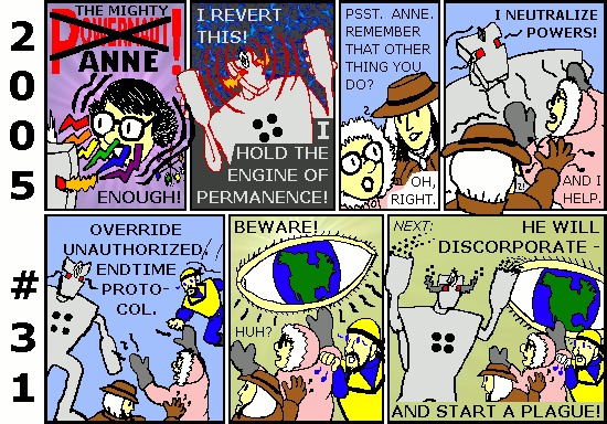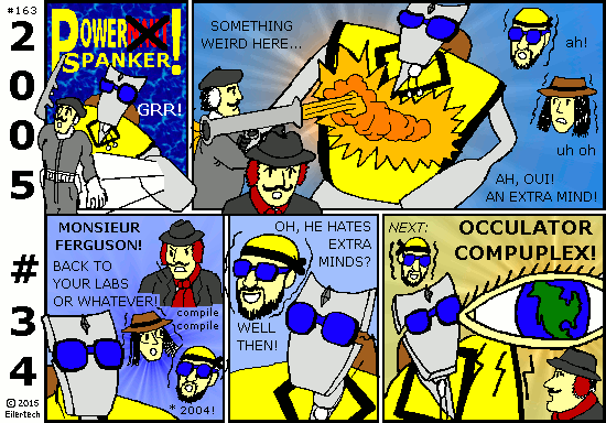 All the links here can be found under http://www.eilertech.com/stories/ .The Occulator Compuplex turned on and off during the crisis. (ref: 2005/occulator.htm) The sources I saw for it were aliens and Earth former-superhumans. Yet it survived the depowering and imprisonment of those same sources. I'm not sure it was actually around *during* the crisis for Spanker 4 to abuse; it had packed our minds full of useful information, like what Spankers turn into when they're about to be defeated. But in any case, the Occulator came back after, with the power of so many minds it could overwhelm any amount of mind control. Oh, thank you Lucianus Autonomus. When you recreated the Occulator Compuplex, you buried its power and made it spread! By the time Spanker 4 put North America in a jar, the continent practically *was* the Occulator Compuplex! As for other powers, and for myself... Anne has the ability to neutralize superhuman powers. I helped her even though I have those powers. People might mistakenly think I'm a hero for doing that. But to me, this is no more drastic than every time I have ever been booted out of a software company as an employee, contactor, or vendor. In both cases, I usually take a nice vacation and then come back in six months. So I'm not selfless; I've just been there, done that. As for the Powernaut... He surrendered his power too! He knows power; he *is* power. And he knew where the power needed to be. He, I think, is a hero. |
