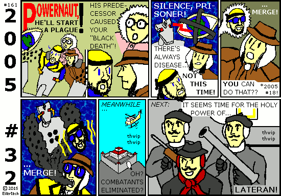 All the links here can be found under http://www.eilertech.com/stories/ .I met Monseigneur Lateran once. He was making a power play for control of a megachurch. (ref: 2004/aleut.htm) We did not play well together, to say the least. Since then I've done my research on him... He tries to look and dress French, but he is really from Quebec. His bodyguards are Swiss. Indeed, they are former Swiss Guards from the Vatican. The Vatican has excommunicated Lateran, but he still has influence there and considers himself fully Catholic. And Swiss guards should never be underestimated. Switzerland fended off the Nazis with Swiss home guards. This is not to say that Lateran is an evil Catholic. He's more an opportunist. When I met him, he was attaching himself to vaguely-Protestant megachurches. Philippe St. Joseph Lateran is no leader. He loves to attach himself to real leaders, and then exercise influence. In the 1990s, his favorite movement *took down Ellipsis*! I (of all people) was actually the one who brought Ellipsis back! (ref: asabove.htm) Lateran has mind-control powers. I suppose Ellipsis has those powers too, but Lateran's are different. Ellipsis is a master at configuring individual minds, including his own. Lateran, on the other hand, rewrites *mass quantities* of minds. He often finds some resistant minds; he usually has others deal with those. I was one such speedbump in his world, so he's given me special attention. ... anyway, Lateran seemed to be an independent operator when we met him in 2005. That was no improvement upon his normal state. |