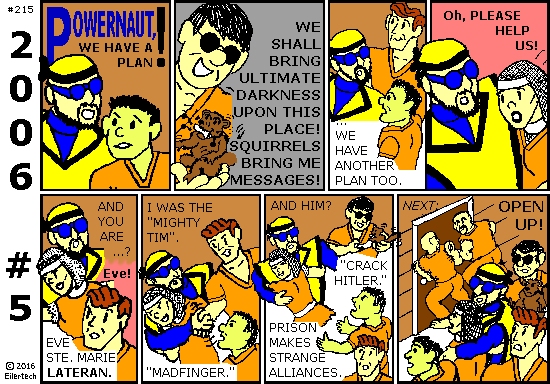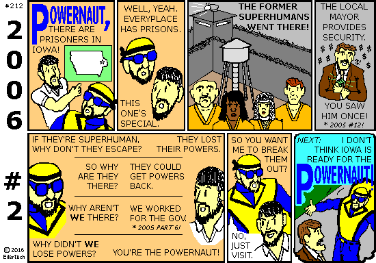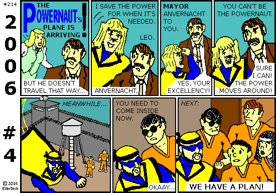 Karl didn't really need the Powernaut to *do* anything at Prison Camp Iowa. He figured, just *being* there would be enough to shake things up. When the Powernaut decided to help me watch Ellipsis instead, Karl came up with Plan B: Send some *other* hero whom Anvernacht hates. Fortunately there's no shortage of those. Many were in Anvernacht's prison... but Leo was outside! He'd been with us in Iraq. And he had some history with Anvernacht, almost as much as Ellipsis himself. So he was *eager* to dress up as the Powernaut, just to psyche Anvernacht! It was *not* required that the guy in the Powernaut costume actually have Powernaut powers. The guy who *did*, just had to be brave enough to bluff an evil mayor, and (ideally) competent enough to defend himself if things went wrong. Basically (in pop culture terms), Karl got Wolverine (missing powers, yet still with some claws) to dress up as Superman. It took some time to arrange this. Meanwhile, the Powernaut signed back on for Plan A. But Karl and Leo saw no reason to abandon Plan B. So, the Powernaut got a diversion in support of his own mission! |