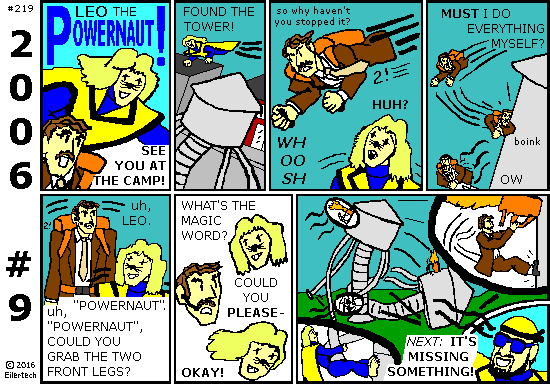 Always before this, I considered eleven strips the upper boundary for one episode, and thirteen strips the lower boundary for two. I could yet divide the episode in two; I'd always considered a separate episode for the March of the Vincible Stomper. But if I did it now, readers would be confused when they read the panel that says "Next: 2006 Part Three!" So, I'm likely to just make this a mega-episode.