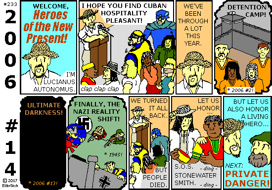 This was the Caribbean in August. I'd really rather not have been there. But since I was, I get to report. This is a Powernaut story, so it does not represent how boring this conference actually was. Basically, *everyone* got to report their status. I will admit, this series hits the high points. And I may have left before the action. But I'm glad I was at least there for Kwame Cannon. He's the son of Stonewater Smith. |