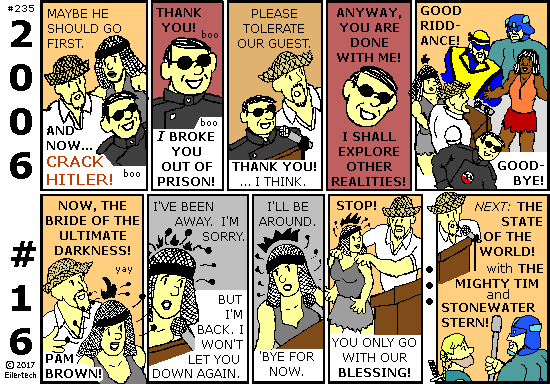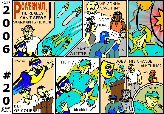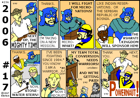 You might think, I keep heroes such as the Mighty Tim around just to make the Powernaut look cool. Well, if it were Mighty Tim Comics, the Powernaut would be there to make *him* look cool instead. One may even *see* the Powernaut making the Mighty Tim cool once, in an old 2011 text story from before Powernaut Comics!