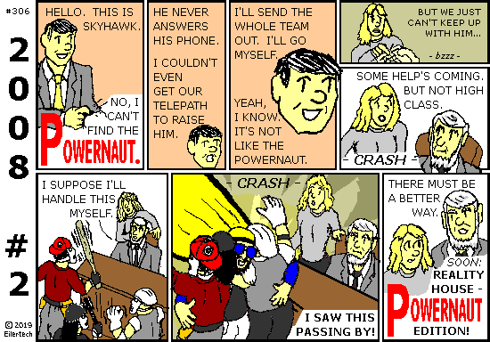 A follow-on series will explain how the Powernaut gets to his 2009 state, wherein Skyhawk is around and Karl Scribner is not.