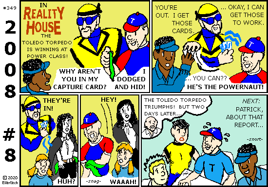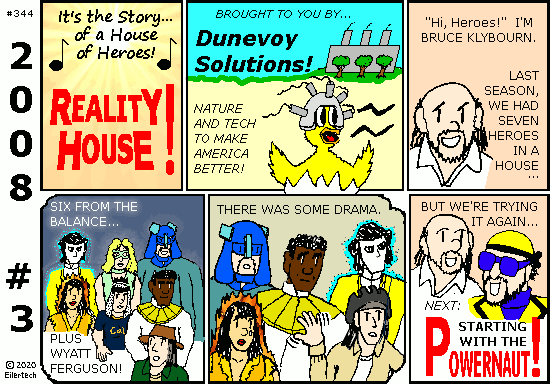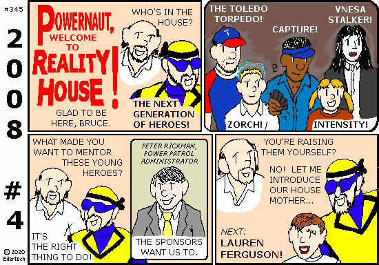If your name is Patrick and you come from Lansing-Michigan, you are invited to contact the Powernaut on Facebook and claim the Toledo Torpedo. I will also let Karissa Stoker from metro Dallas-Texas claim the rights to Khrisa and Vnesa Stalker. (Heh, someone else came up with Khrisa's character name, but he was inspired by Karissa.) I will also let Amy Estes Larsen from metro Seattle-Washington claim Intensity. I will also let Karen Eiler, Mark Eiler, and Andrew Jones claim themselves from superhero games we used to play when we were all younger. Bruce Klybourn is a character of Vaughn Gross. Other than that, the story and all characters and artwork in this fiction are copyright © 2020 by Eiler Technical Enterprises.