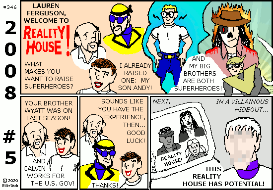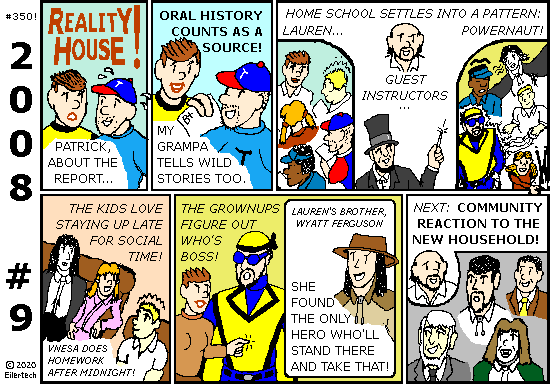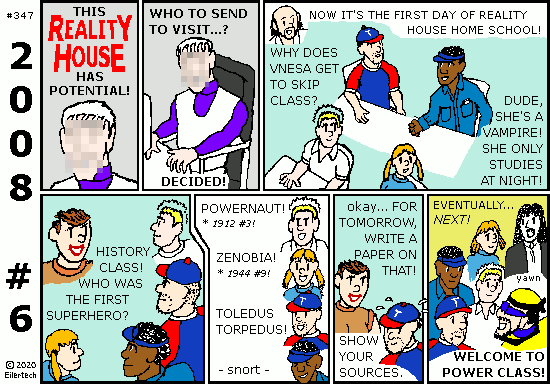 Heh, the Reality House is splurging on guest instructors to make the series interesting. Chief among these is "Abe Knight", who practices law in Illinois - and strongly resembles Abraham Lincoln. There are rumors that he went to space before supposedly dying, the same way Zenobia did. Abe Knight neither confirms nor denies these, but he loves to end his sessions with what *could* have happened if Abe Lincoln went into space. Other instructors have included Budo (a freelance swordsman from New Jersey), Mister Discipline (a businessman in Times Square of New York City), a former football player named Peerless, and the guy who once dressed up as the Mad Axeman from Shenandoah. They each had at least something to say about superhuman history and the modern world. |