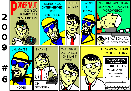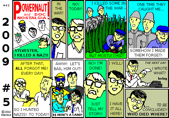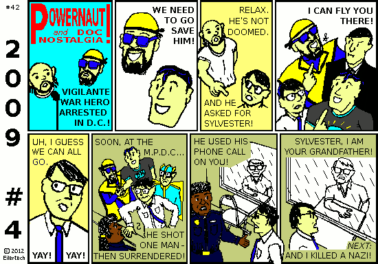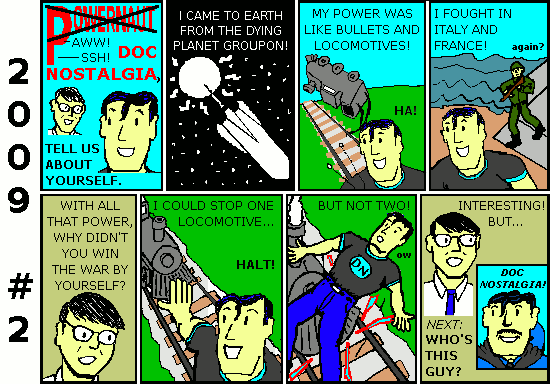 The guest character Doc Nostalgia has his own history. And it doesn't even reconcile with Doc Nostalgia's history from last month's Powernaut comics. So I don't presume to reconcile it with the history of every other character who's ever met Doc Nostalgia or the Powernaut. Let's just say, the friends of the Powernaut are going to have a hard time finding evidence of Doc Nostalgia or his friends after this adventure. Fractal history with multiple foci, dont'cha know. Plus, people forget things, as will soon be revealed. Heh, time is pointy. (Thank you Andrew P. for that observation.)