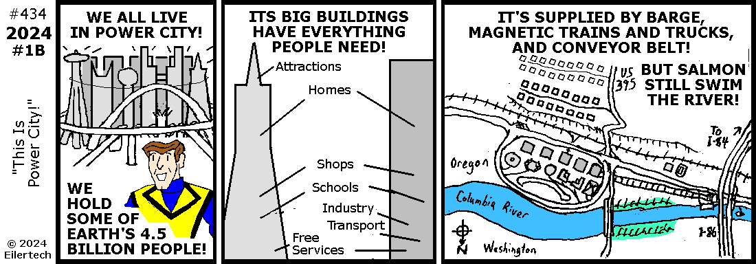 As for the architecture... When Power City was founded, it went for a classic look, full of iconic skyscrapers. Those can actually be designed as arcologies, which bring humanity together to receive essential services with much less impact than sprawling suburban architecture. Some suburbs exist up the cliff from us... but I have convinced Powernauts to not live there. We live in and around the Power School grounds, for public safety and for communion with the students.
