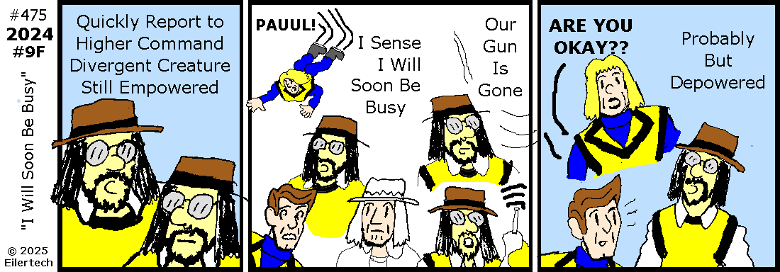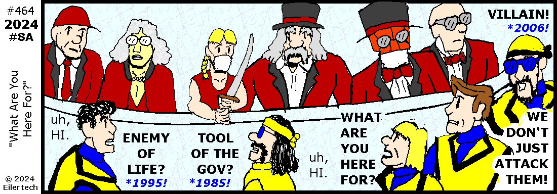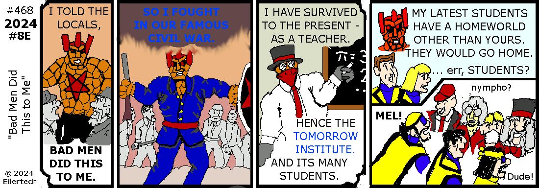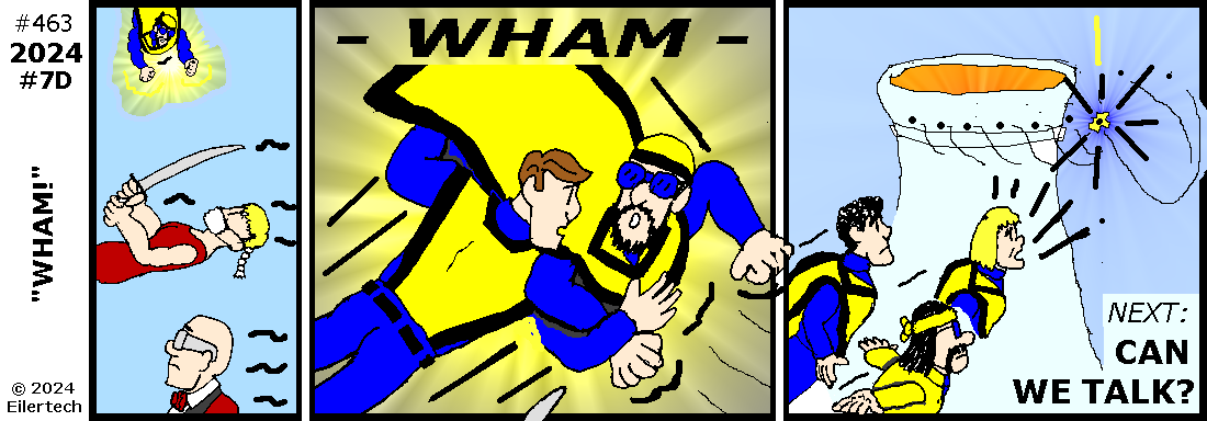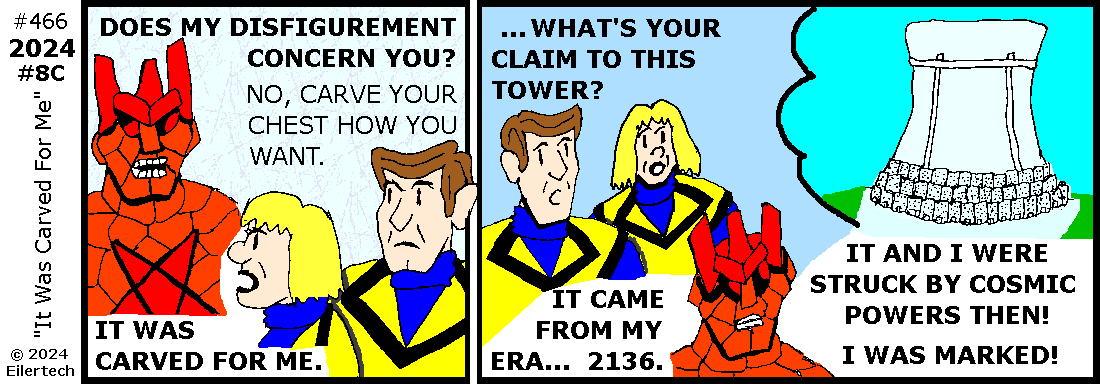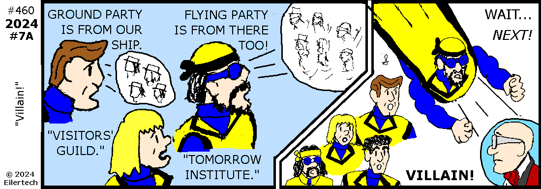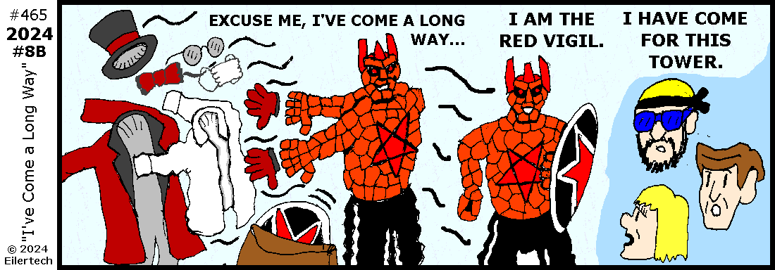 Ha! A villain I met in 2006 is trying to access the new tower, and he's brought people to guard him! I'm spearheading our way into the action!