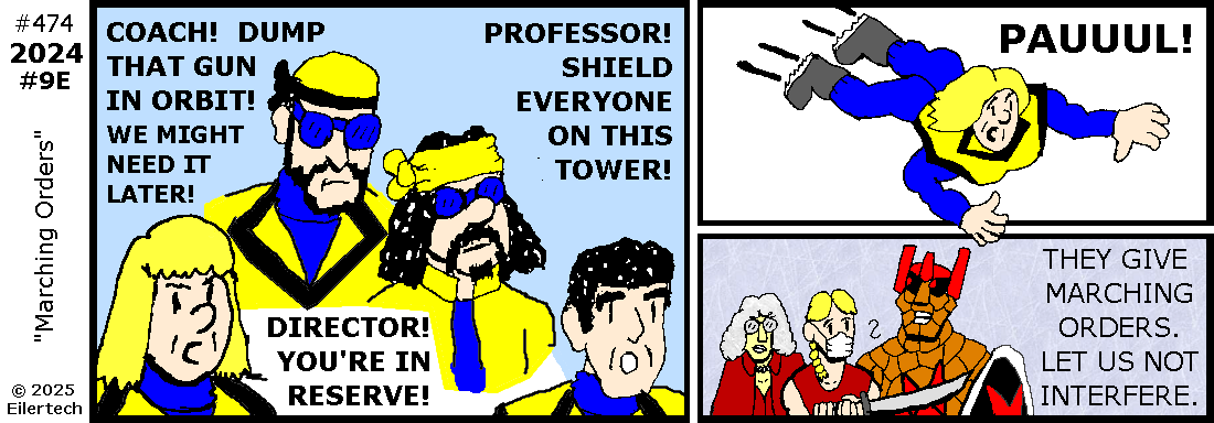 Crud! We Powernauts have found two parties from our ship on unauthorized shore leave, to explore a mysterious new tower. My colleague "Coach" Powernaut is taking extreme measures against that - at risk of his own life! Even I've learned not to just attack visitors, thank you "Director" Powernaut... [2014] Anyway, it's time to go keep him from impaling himself!
